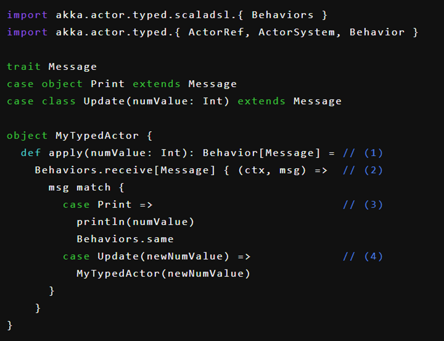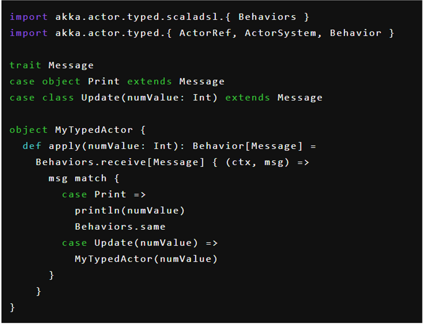 Actor モデルはその概念上ステートフルであるため、Actor は基本的に Mutable なインスタンスになります。そのため Actor に何かしら状態を管理させたい場合は Mutable なプロパティを持たせる必要があります。これはそういうものなので、まあ、そういうものなのですという感じなのですが、Akka Typed では関数型的な仕組みを提供していて、関数の再帰処理で Actor を記述できるようになっています。
