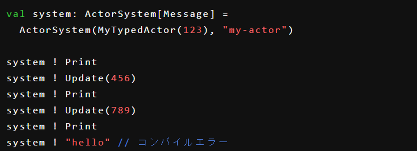 Actor 側でも、受け取る型が決まっているので case _ => のようなフォールバックコードが不要になります。また、網羅性のチェックも Scala のパターンマッチの仕組みを利用してコンパイル時に行うことができます。そのように全体的にコードがすっきりして見通しがよくなりかつ安全性も高まります。