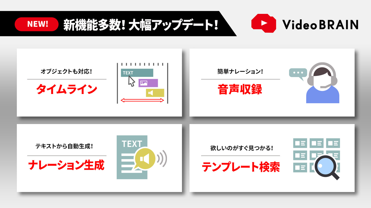 Video BRAINは、動画を構成する要素ごとに出現タイミングを指定できるタイムライン機能の拡充や音声収録など、多くの新機能を追加した大型アップデートを行いました。