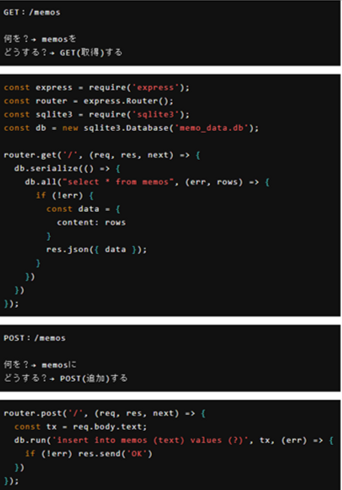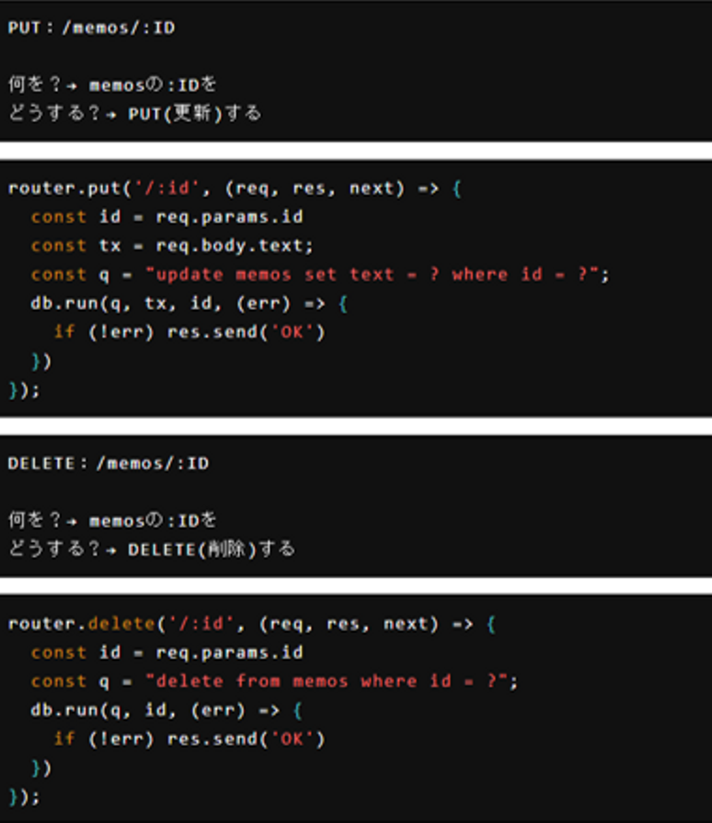 リソースの取得、作成、更新、削除といった操作は、すべてHTTPで定義されているメソッドを利用すること。よく使うのは、GET(取得)、POST(登録)、PUT(更新)、DELETE(削除)の4種類です。