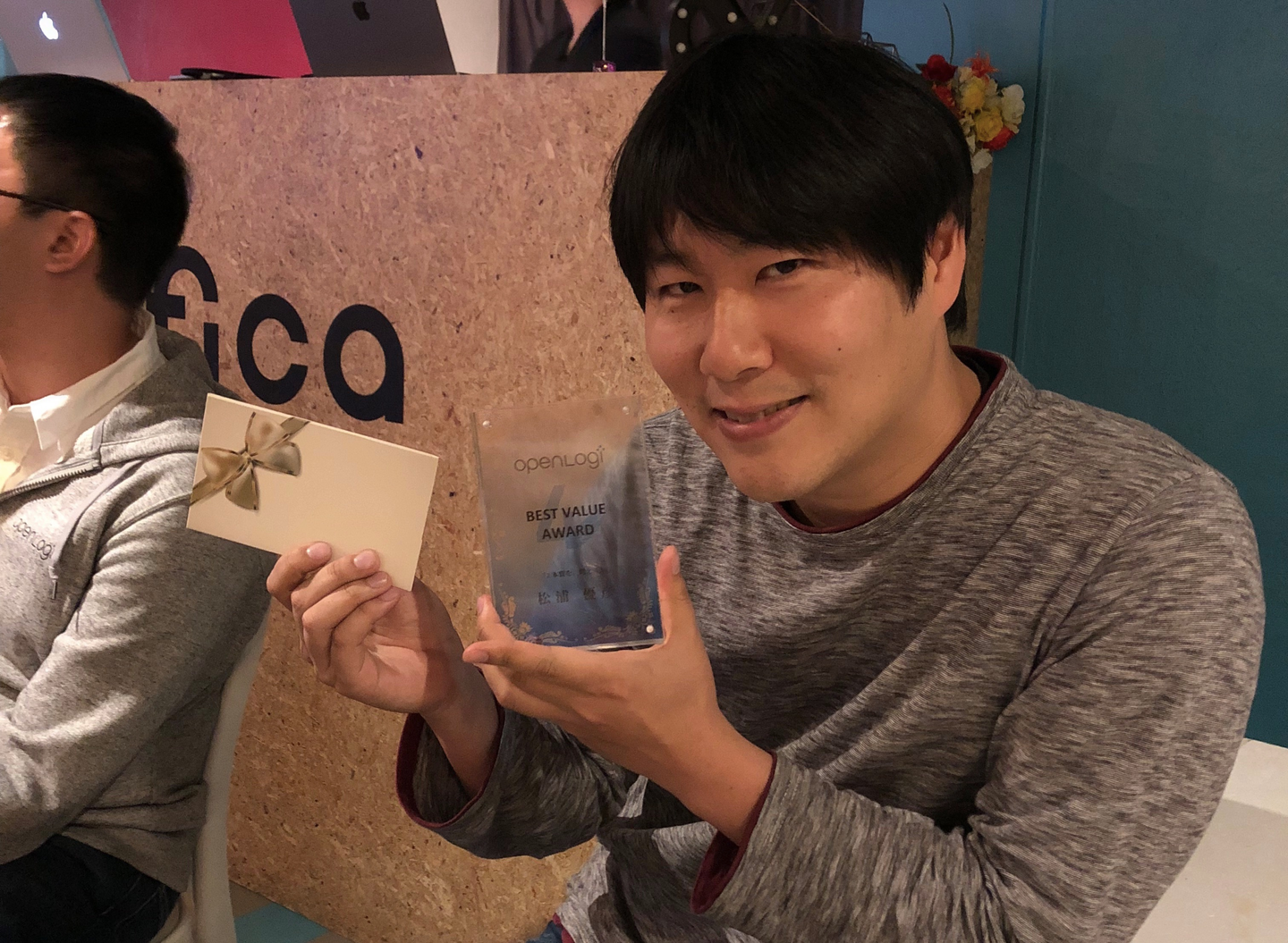 しかし、ここはさすがリモートワークが浸透しているオープンロジ。なんと、現地の黒岩さんと会場を繋ぎ、リモート授賞式!