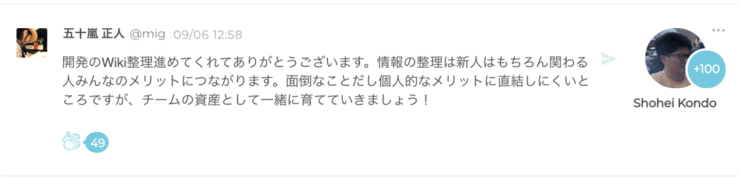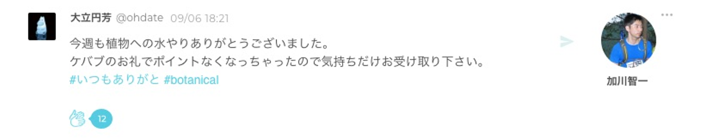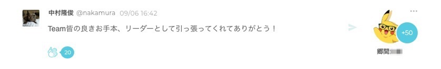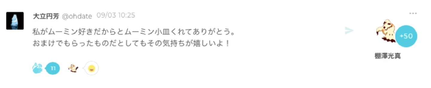 こんなふうに具体的な様子が書いてあると、周囲もその人の頑張りが分かりやすく、感謝された本人も嬉しい!広報チームの私達もさっそくメッセージとThanksPointを貰ったんですが、やっぱり自分のしたことに感謝してもらえるってモチベーションに繋がります^^