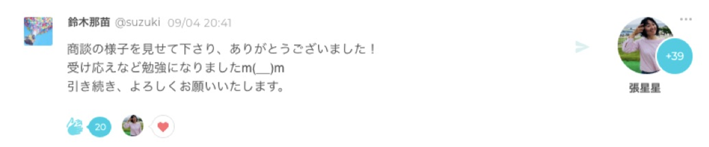 また投稿への拍手もしっかり練習!投稿に共感したり自分も同じ内容で感謝の気持ちを伝えたいときは、拍手ボタンを押して賞賛とThanksPointを送ります。普段話す機会があまりないメンバー同士でも、拍手なら気軽に送り合えるのも良いところですね^^