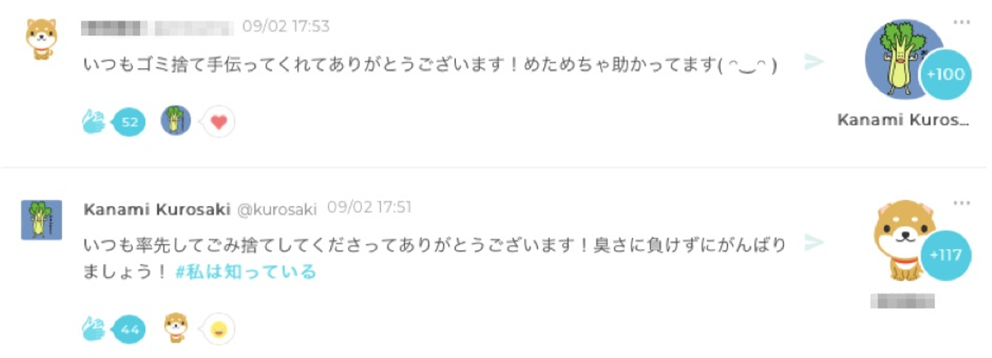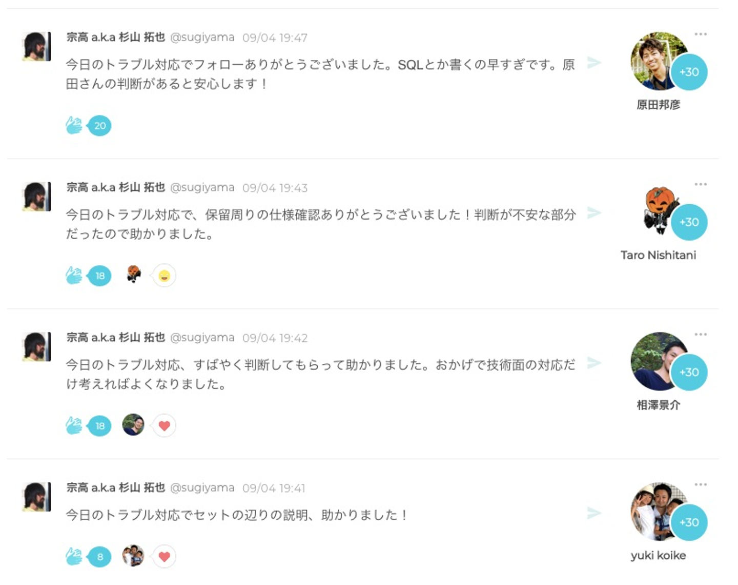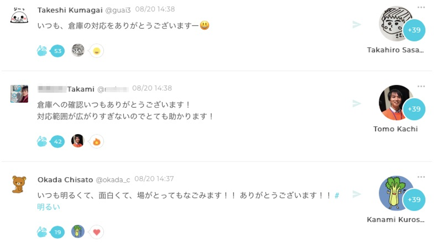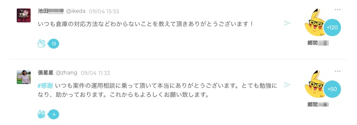 業務中に助けてもらったことや業務外の感謝まで様々なメッセージが送られ、「こんなことがあったんだ!」と、今まで気付けなかった素敵なアクションが共有される感覚をさっそく体感することができました。
