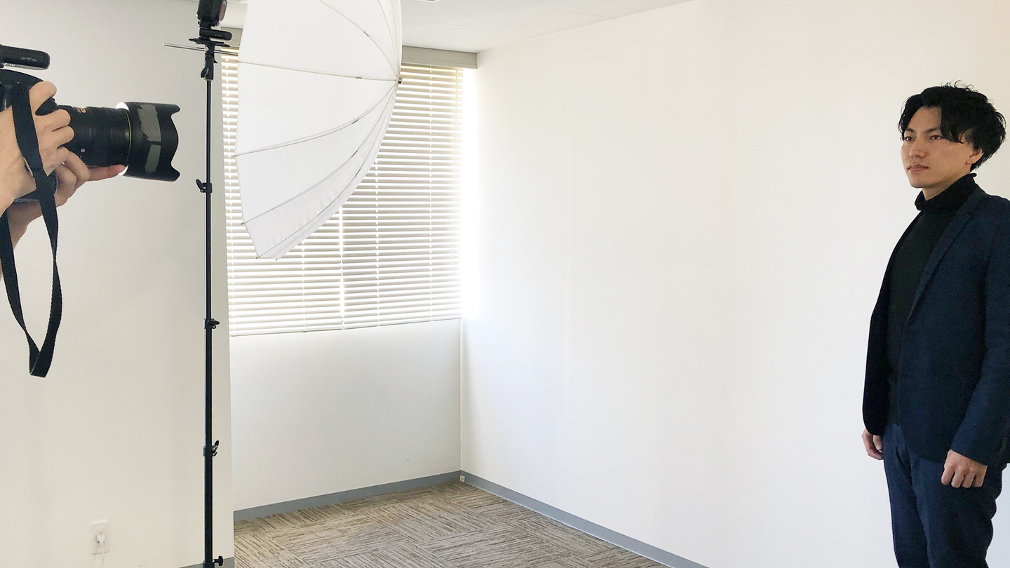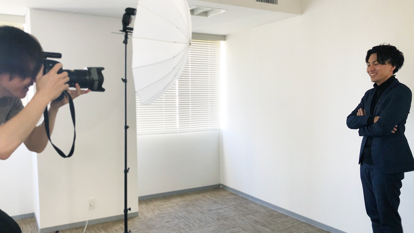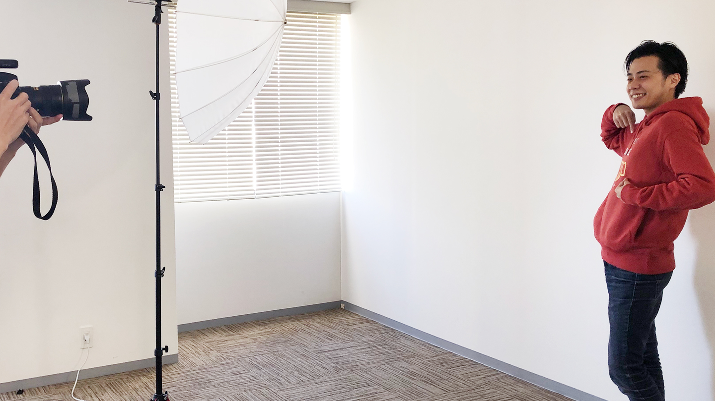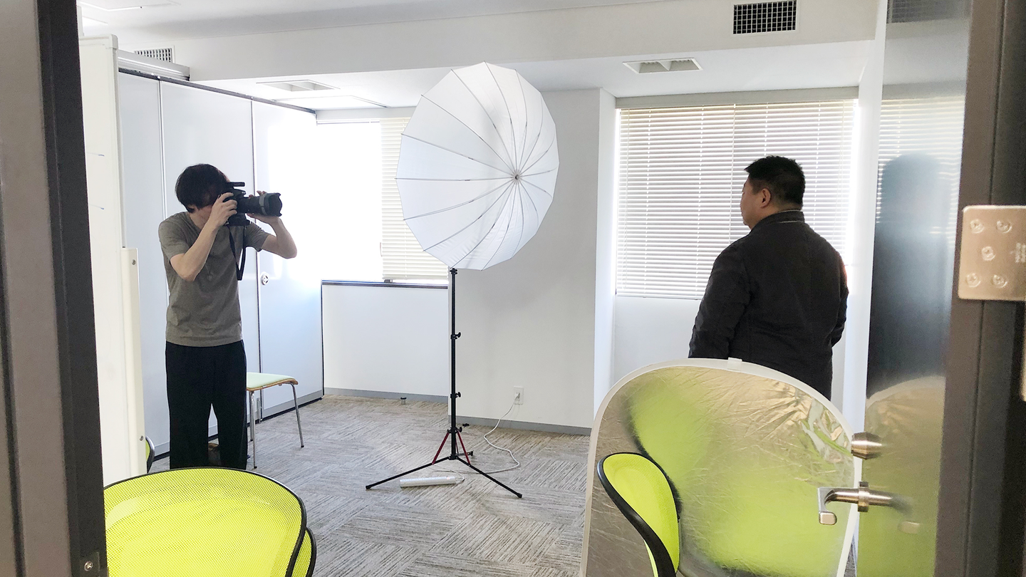 写真撮影は会議室の一室で行われました。机を端に寄せて準備をし、簡易スタジオの準備ができたところでマネージャーを一人ずつ呼んで撮影スタートです。