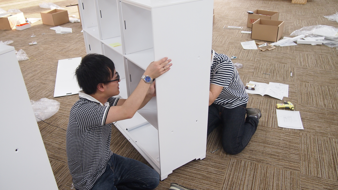 *個人用ロッカーの組み立てをするオープンロジの社員。組み立ても自分たちで。
