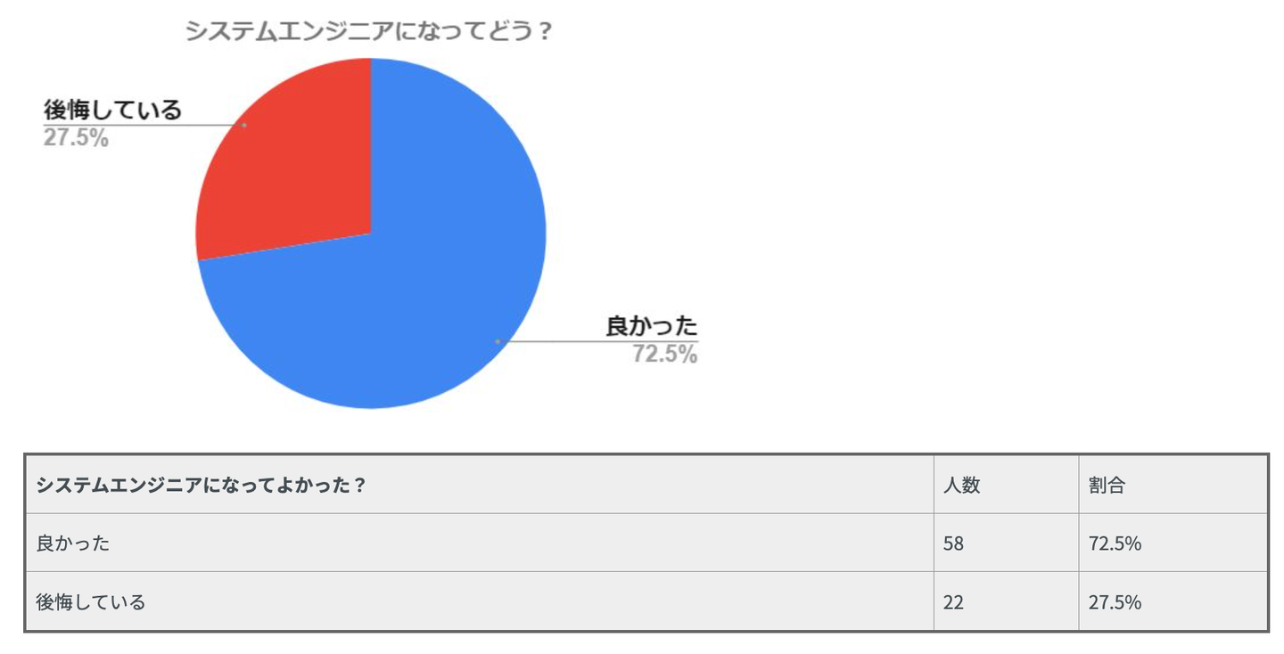 独自アンケートで「システムエンジニアになってよかったか?」という質問した結果、良かったが72.5%、後悔しているが27.5%という結果となりました。