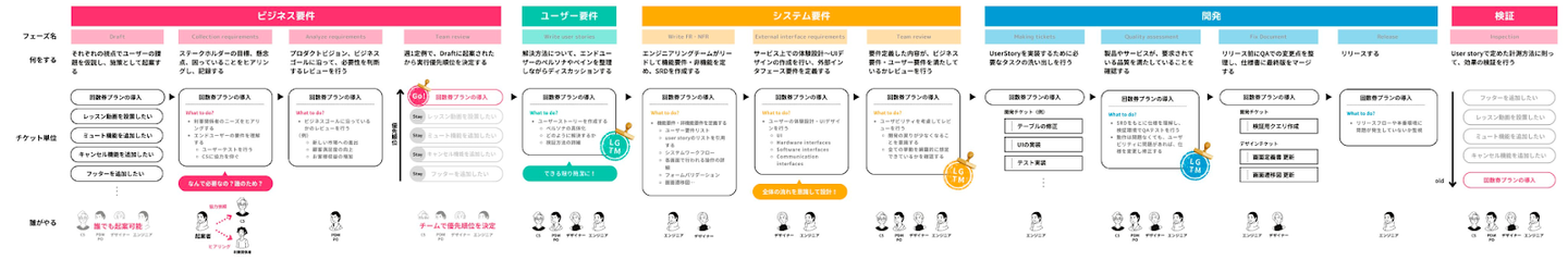 分かりやすい例で言うと、新規プロダクト開発をビジネス・マーケ・CS・エンジニア・デザイナーの5人で進めているのですが、そこでのチームワークフローの可視化をしました。これまでチームでアジャイル※に意思決定を進めてきたのですが、プロダクトが形になり始めた段階で、その意思決定プロセスや理由がドキュメントとしてほとんど残せていないという重大な課題がありました。 そこで、ビジネス・ユーザー・システム要件をチーム全員で思考する新しいプロセスが導入されることに。