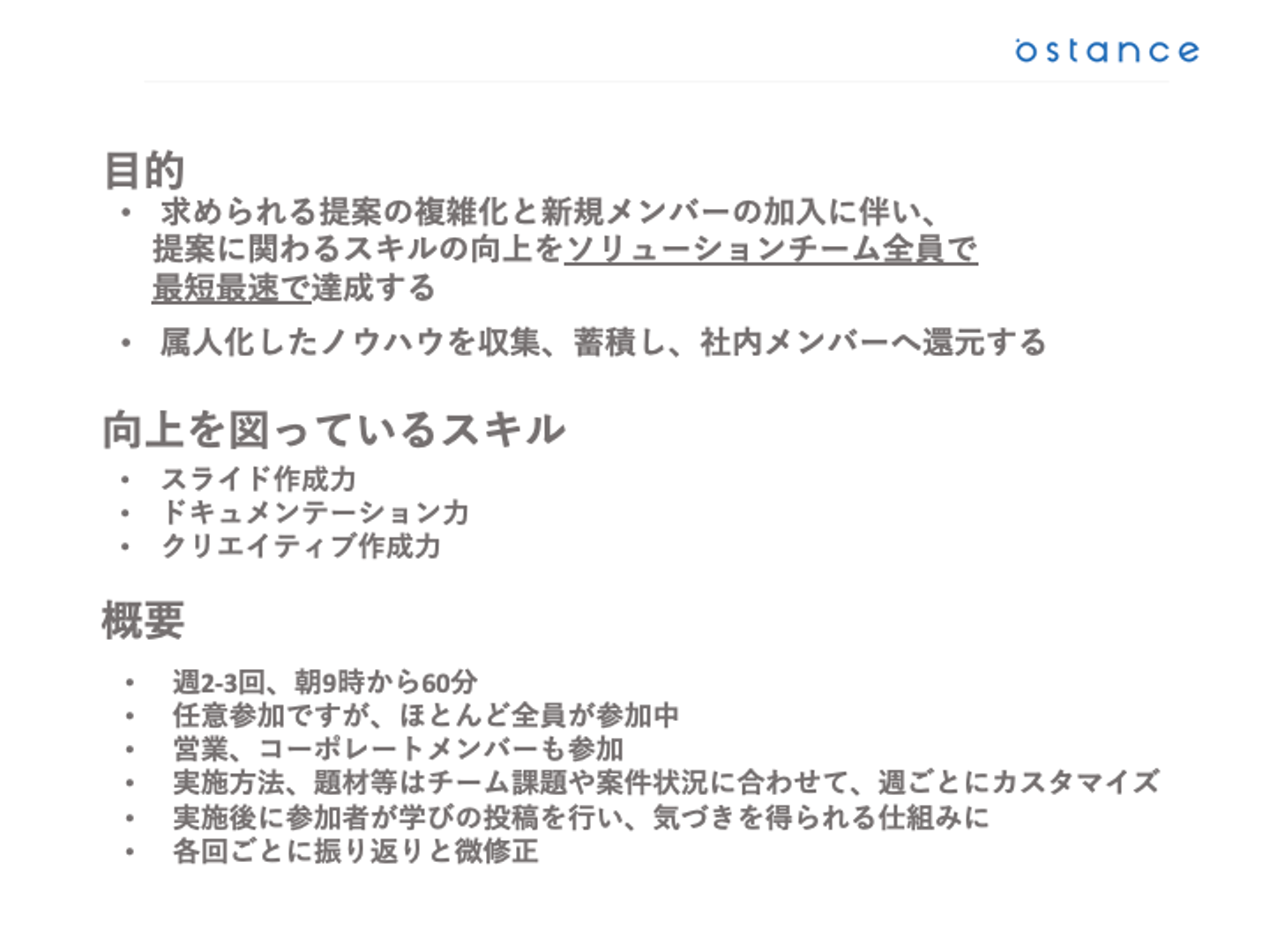また、チーム全体のレベルアップを図るために、勉強会の企画運営も行っています。私自身もまだ入社して数ヶ月ですが、将来的に入社する職種未経験のメンバーがなるべく早く自立し、チーム内で自身の価値を発揮できるような環境を築きたいと考えています。