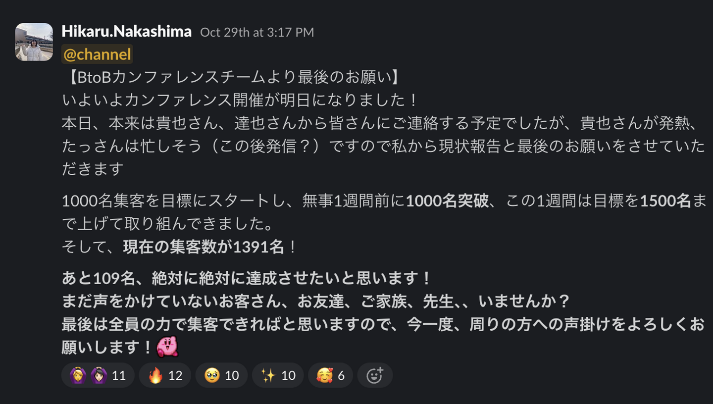 最初はカンファレンス主催者側の目標達成意欲と社内のメンバーの目標達成意欲に乖離がありました。そんな時に、中島さんの提案もあり、全社でそれぞれの集客数を可視化する仕組みや私からカンファレンスの状況に関する共有を週一回行いました。
