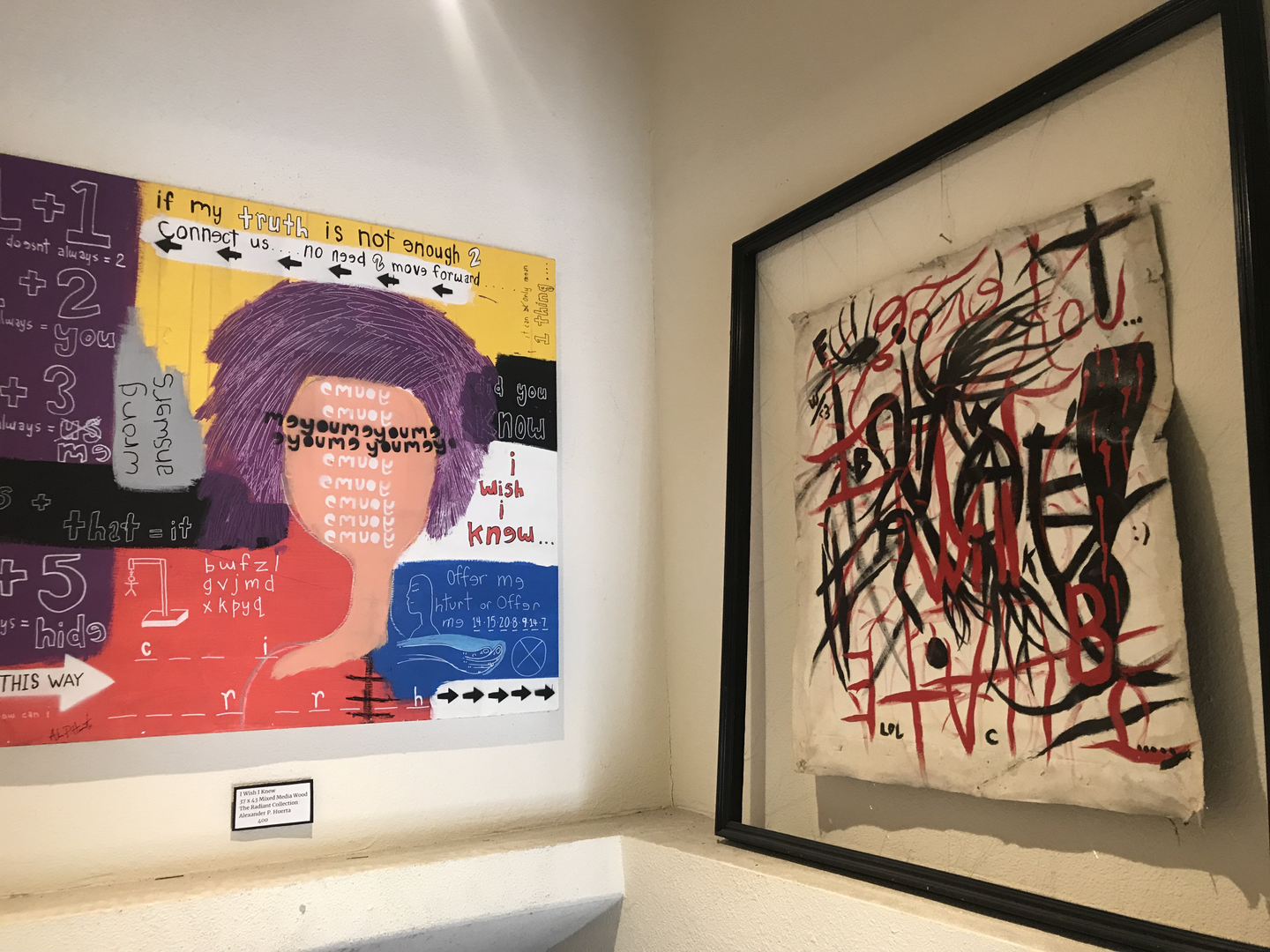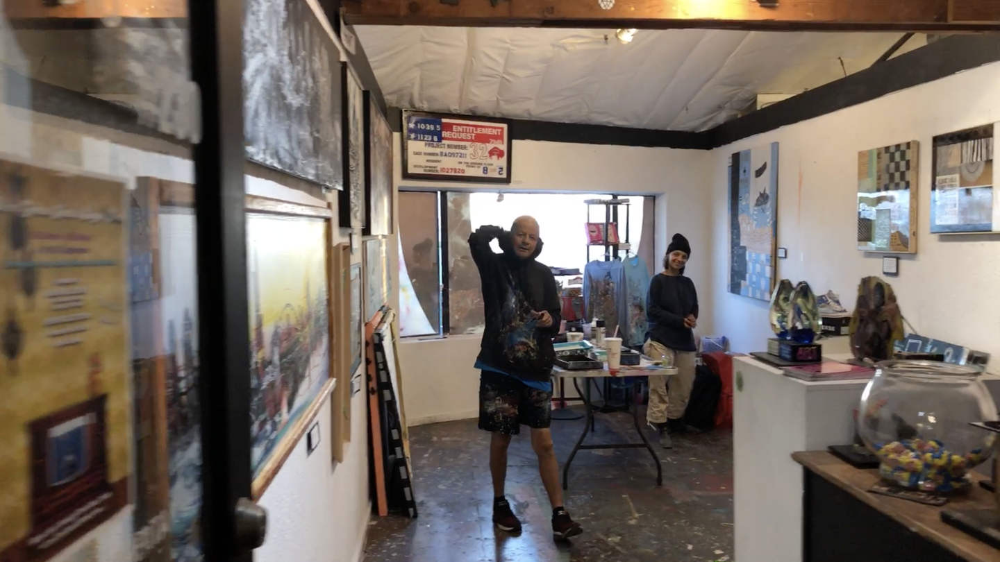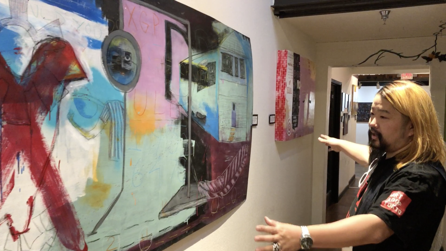 中には絵が無造作に飾ってあり、アーティストが絵を描いている。