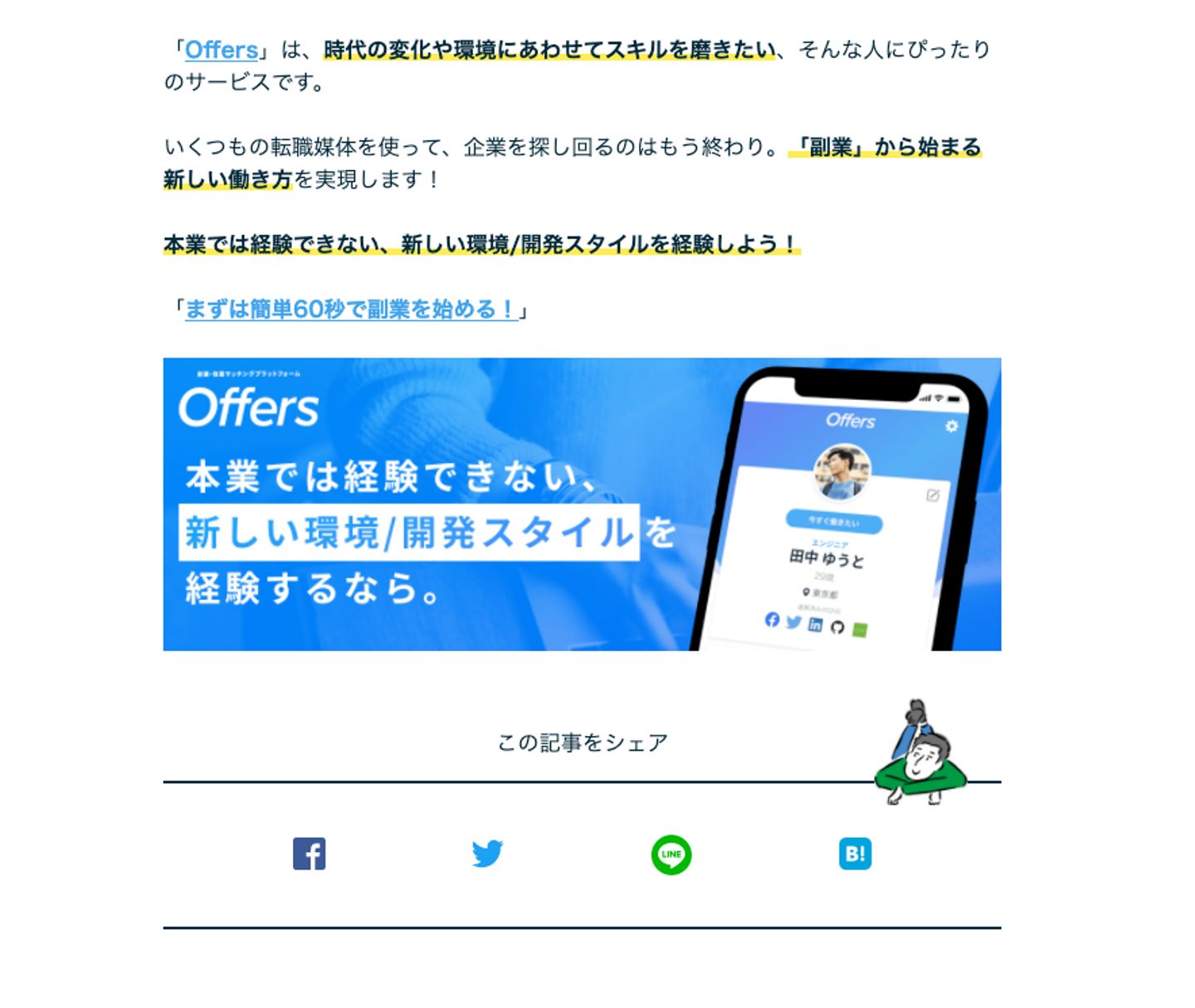 1年程前までは、「Offers Magazine」の記事内にCTAを設置しておらず、ここ経由のCV(会員登録)はゼロでした。一方で「Offers Magazine」には読み応えのある記事がたくさん出てきて読者も増え続けていて、何かできないかと考えたんです。