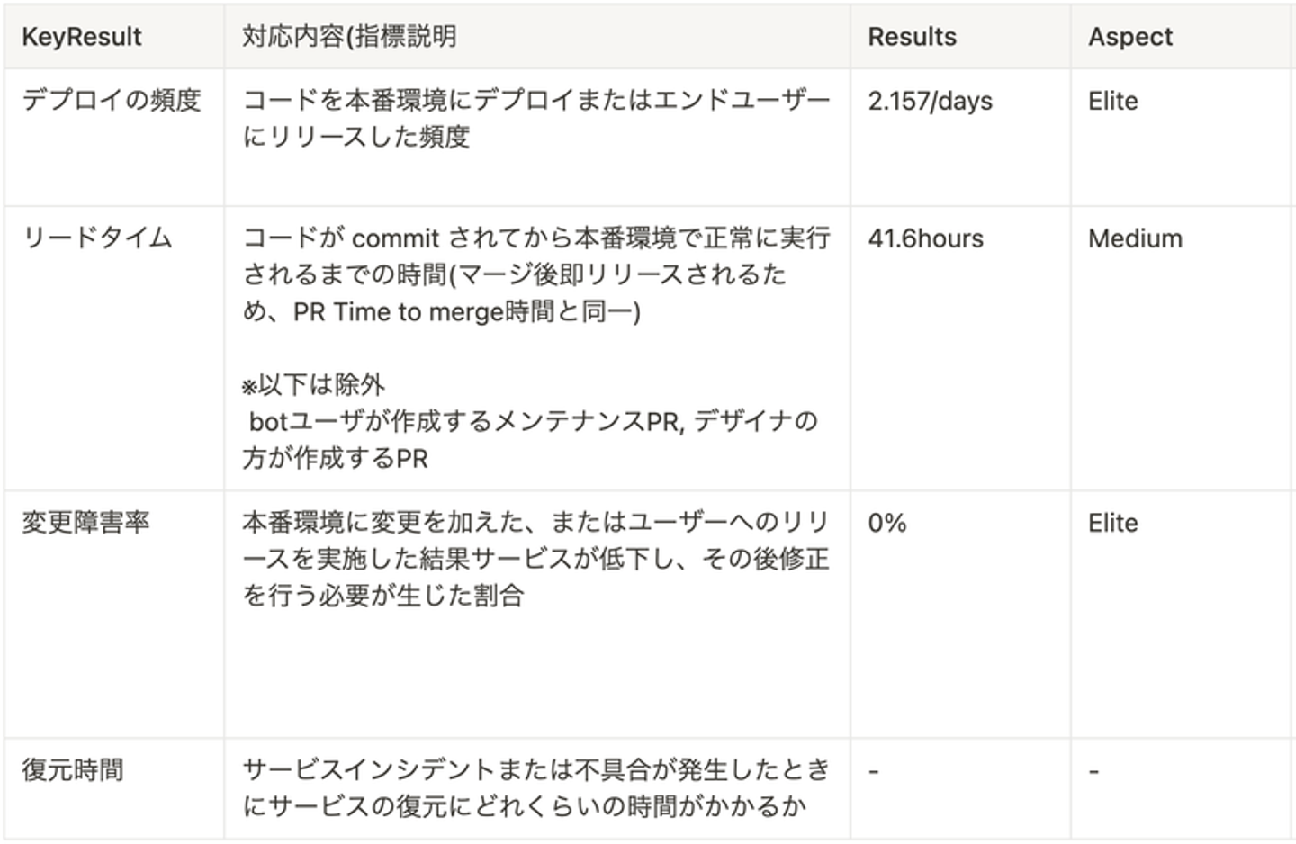 なお、変更障害率・復元時間については、軽微なタスクリリースやSytheticTestによる事前察知によって、目立ったインシデントは発生しませんでした。