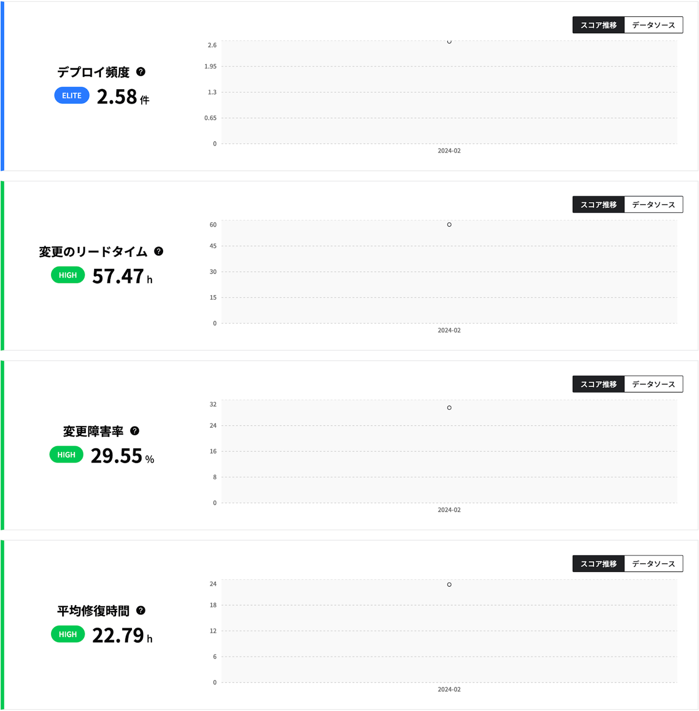 今月は、エリート1つ、ハイ3つという結果でした。先月に比べ、平均修復時間がミディアムからハイへと改善されました🦾来月以降も、より高いスコアを目指していきます!
