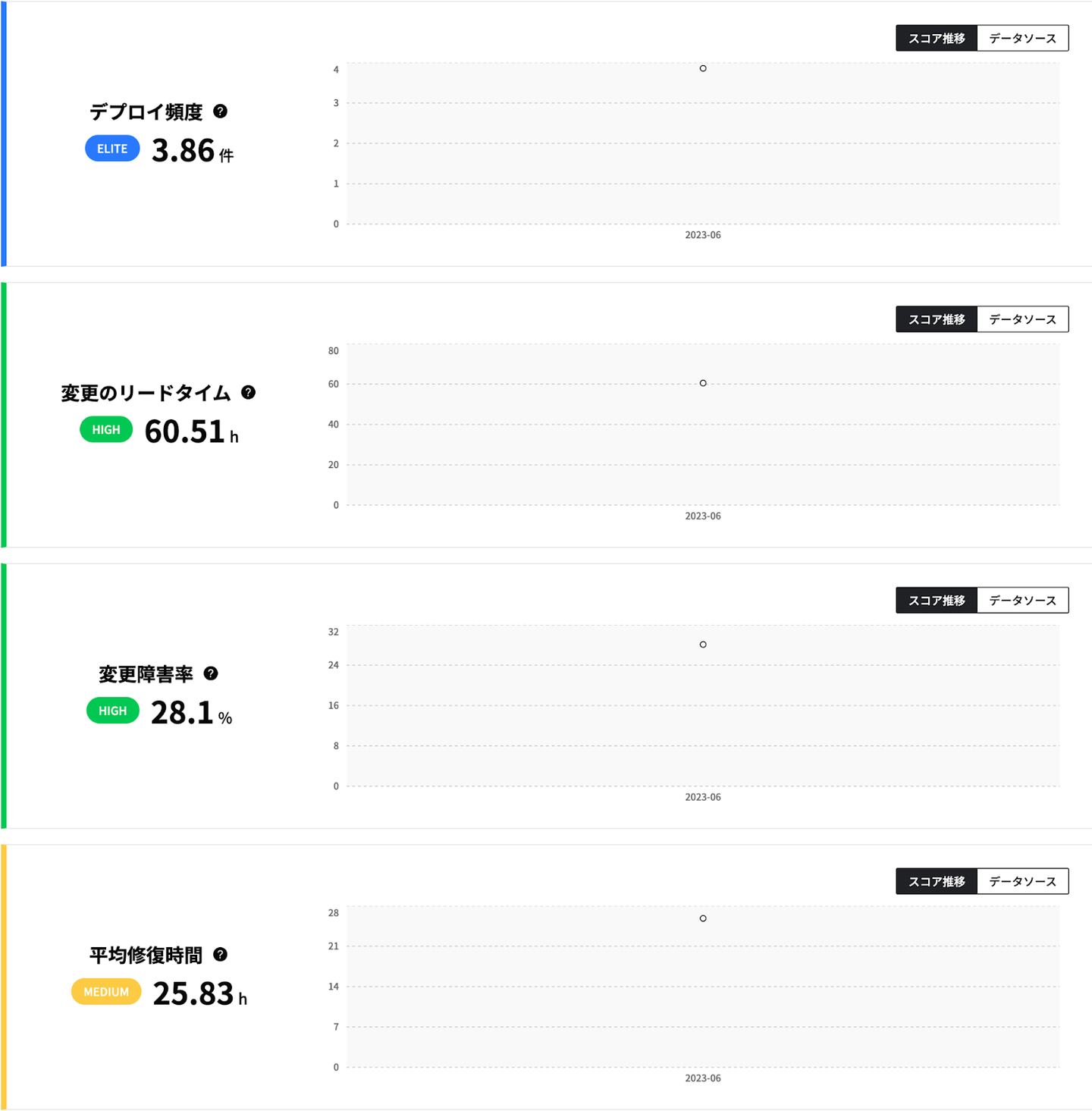 Offers MGRでは、2023年4月に開発生産性を計測するFourKeys分析機能をリリースし、上のようなデータが取得できるようになりました。
