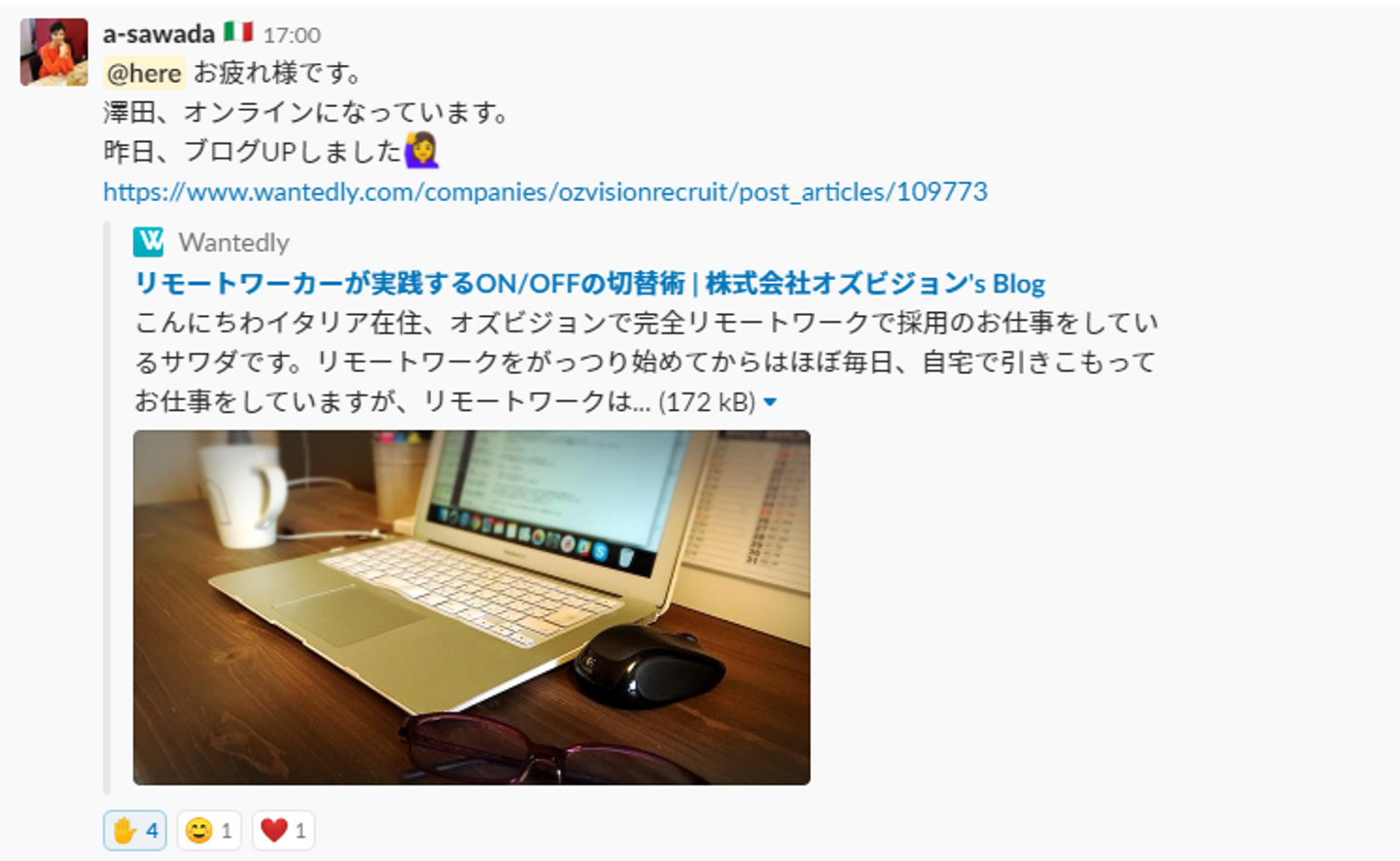 「澤田、オンラインになっています。」とチームのSlackに元気よく挨拶が飛んできます。