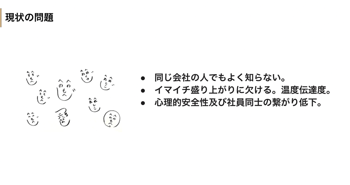 しかし自分の時間を有効活用できる一方で、顔を見て会話をしたり部署を超えて気軽に雑談をする機会が減ってしまい、「同じ会社の人でもよく知らない...」「特に全社間の憶測や噂がコロナ前より増えている..」「心理的安全性及び社員同士の繋がりの低下」といった影響が発生しました。