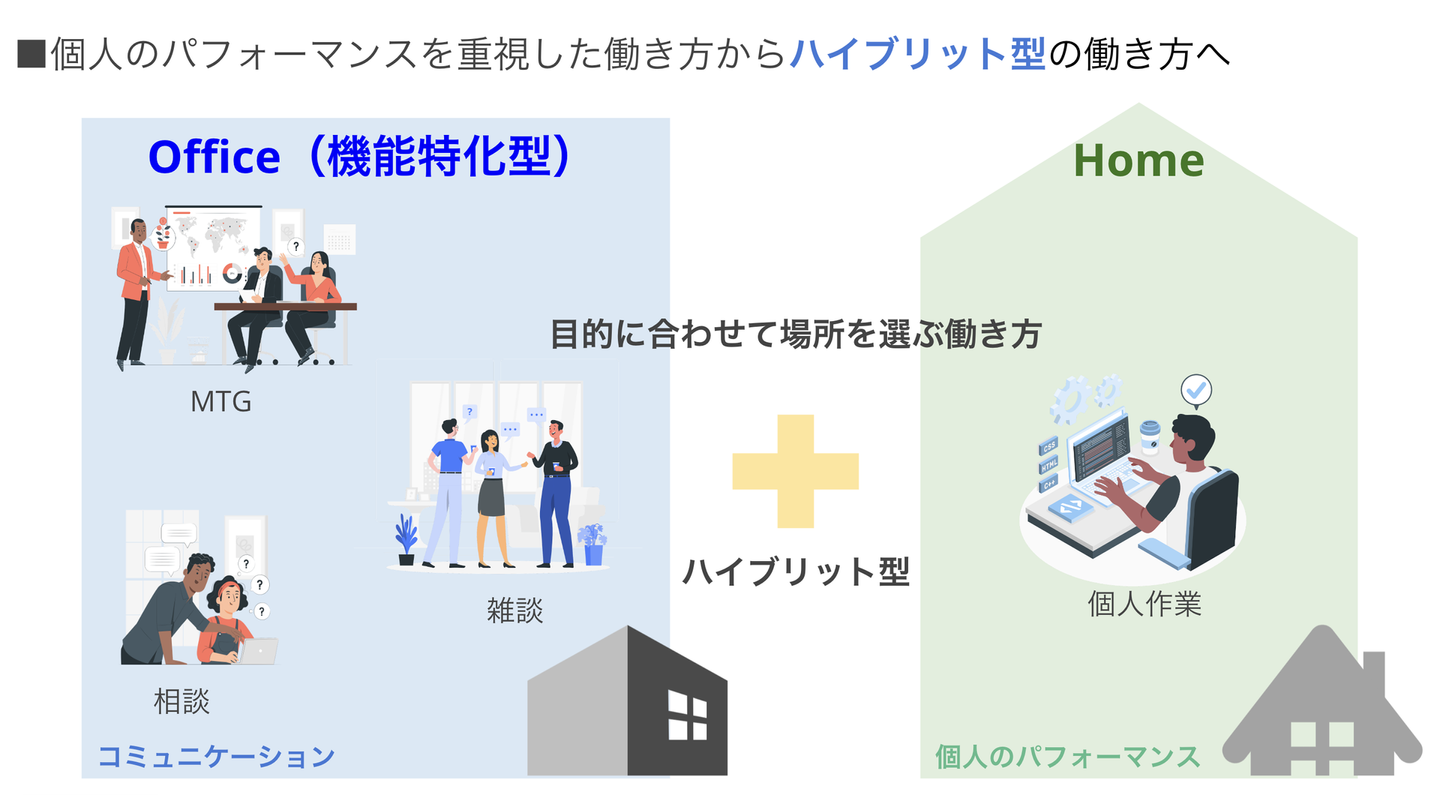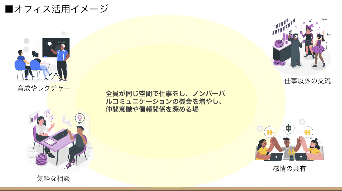 自分の仕事を進めるだけならリモートでよいし、それでも業務が滞ることはないけれど、あえて全員共通の「場」「コミュニティ」「空間」に集うことで、自分の仕事に直接関係のないことにもアンテナを張り、そこから予期せぬアイデアや価値を生み出していき、新しい価値提供へと繋がっていく。