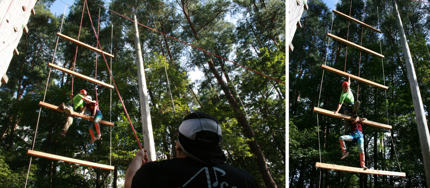 グループのある女性と「巨人の縄ばしご」というエレメントに挑戦しました。大きな縄ばしごを2人で登っていくのですが、相手のちからを借りなければ登っていけないんです。