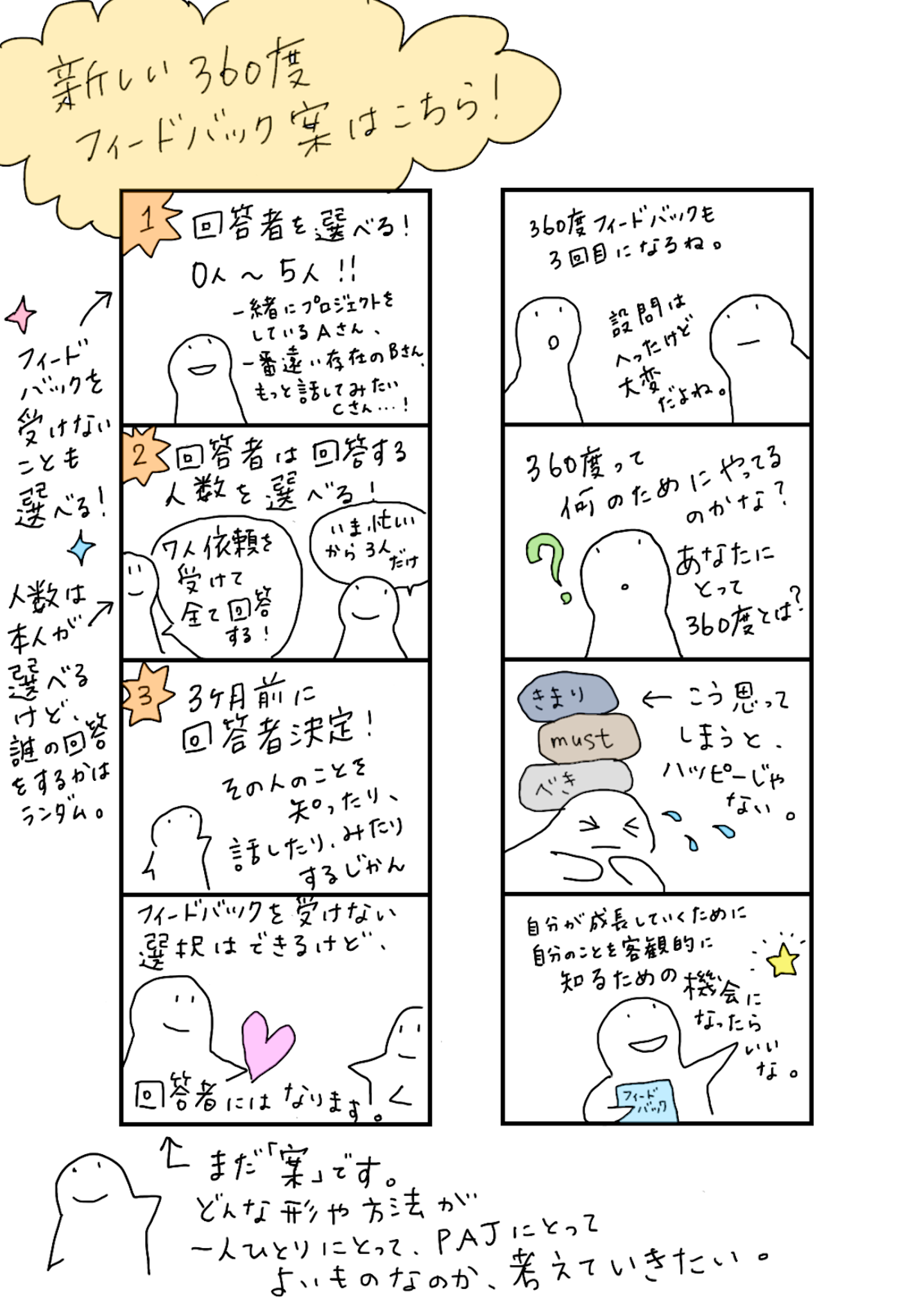 それは「フィードバックを受けるか受けないかを選択できる」というものです。PAJでは極力「やらされる」を排除し、「自らが決める」を大切にしようとしているので、こうして選べるようになることには意義がありそうです。