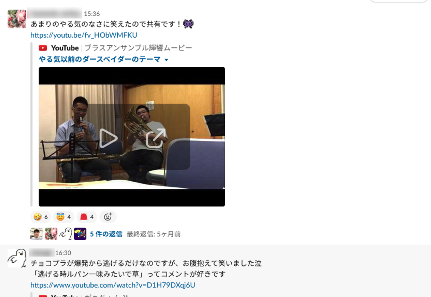 例えば、ここで出た意見をもとに、お笑いを共有するgerachannel(ゲラチャンネル)については、観た人がより反応しやすくなるような工夫として、ざぶとんの絵文字スタンプが作られました。(slackでは、コメント反応できるスタンプを作成することができます)また、これに伴いfikaチャンネルでも、新しい反応スタンプの案が出たりと、お互いの運営者が集まることでシナジーも生まれています。