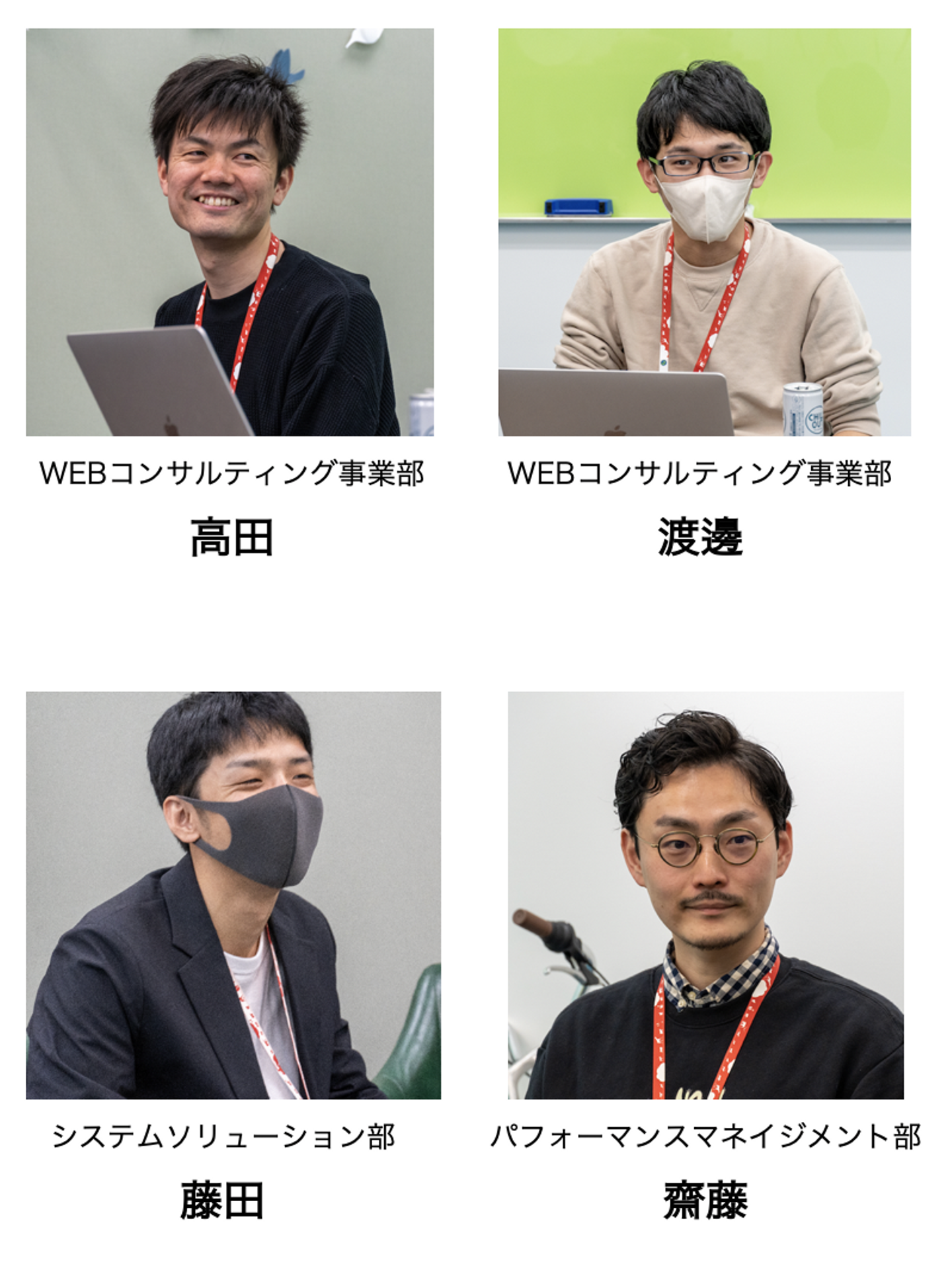 上段2名は、クライアントへのコンサルティングを行うプロデューサー、左下がコンサルタントの提案をテクノロジーで形にするシステム担当、右下は経理担当の4名。