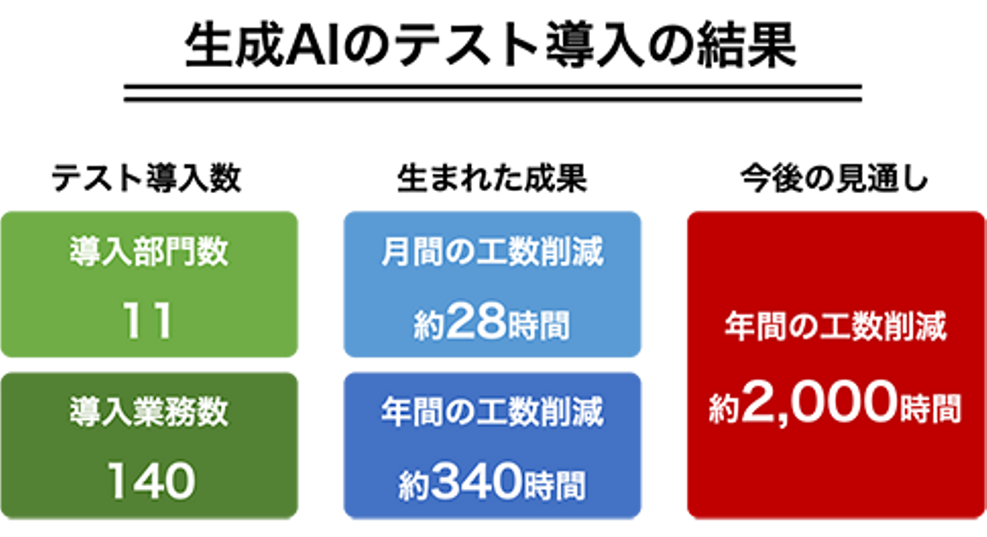 セキュリティ上のリスクを考慮して、AIの学習への保護対策も実施しながら、機密性の低い業務を対象に全社横断的なテストを実施しました。