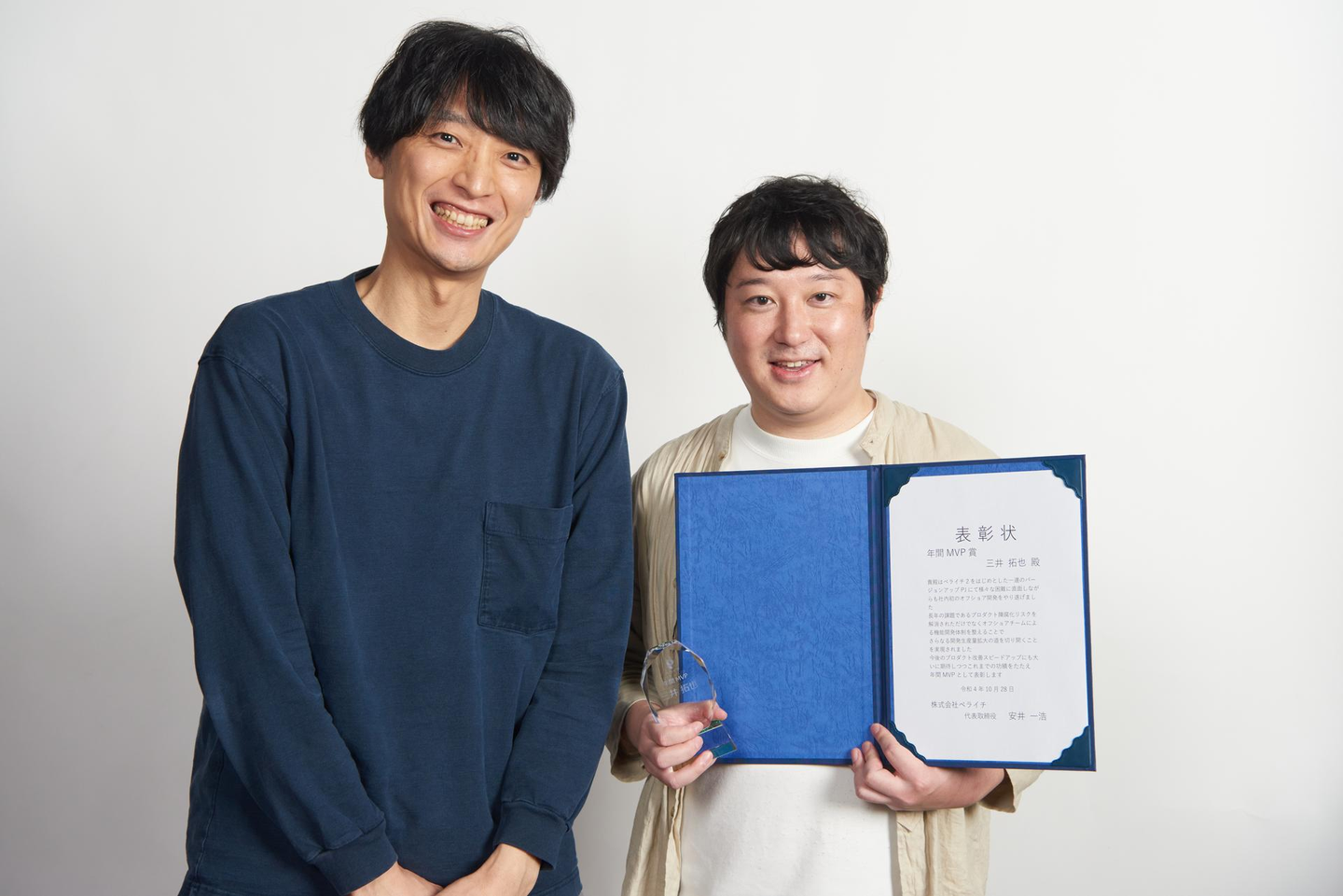 (写真↑)MVP(年間)の受賞、エンジニアリングマネージャー(EM)の三井さんと香月CTO
