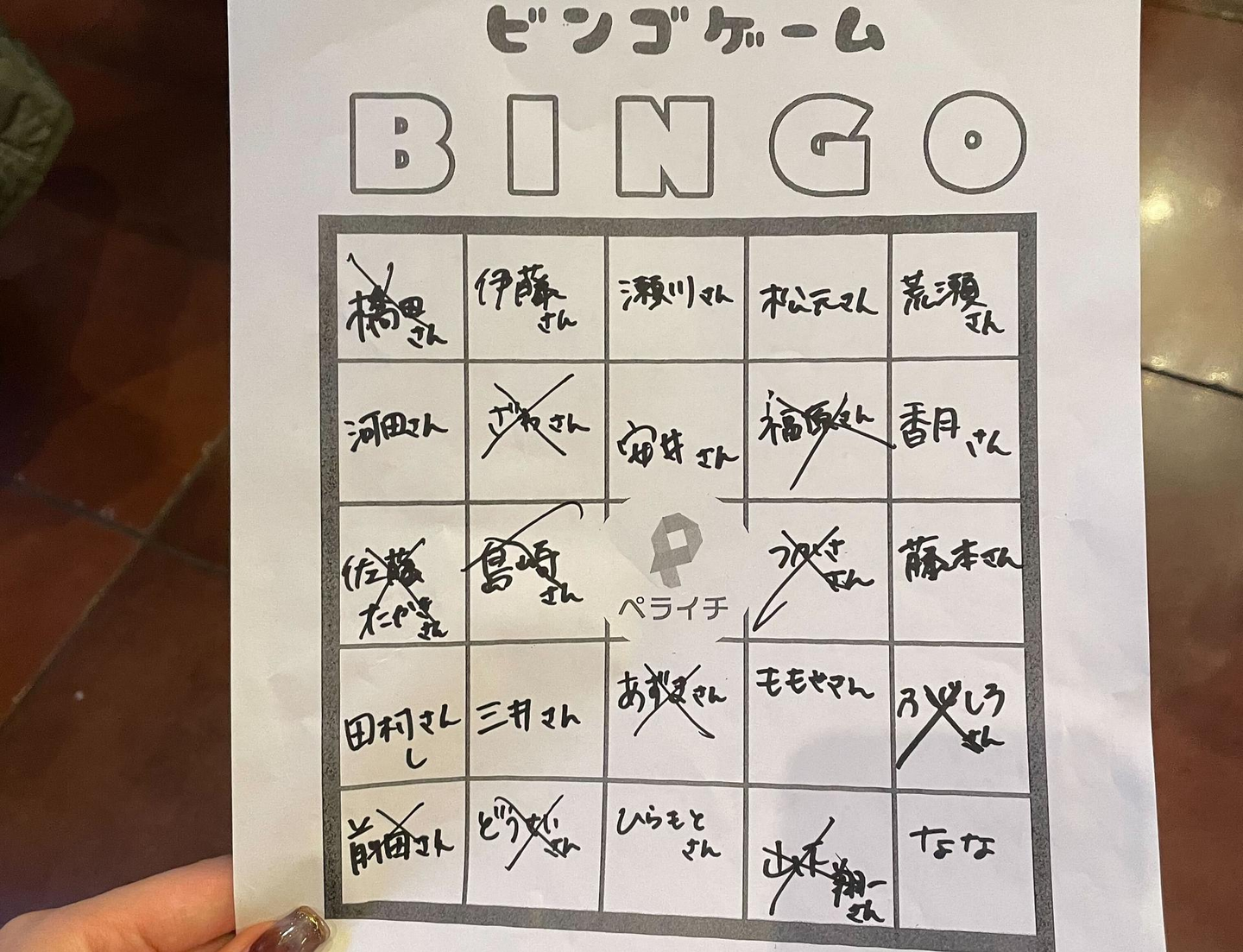 (写真↑)実際のビンゴ用紙の様子、このように各人で好きに名前を書いてビンゴゲームをしました