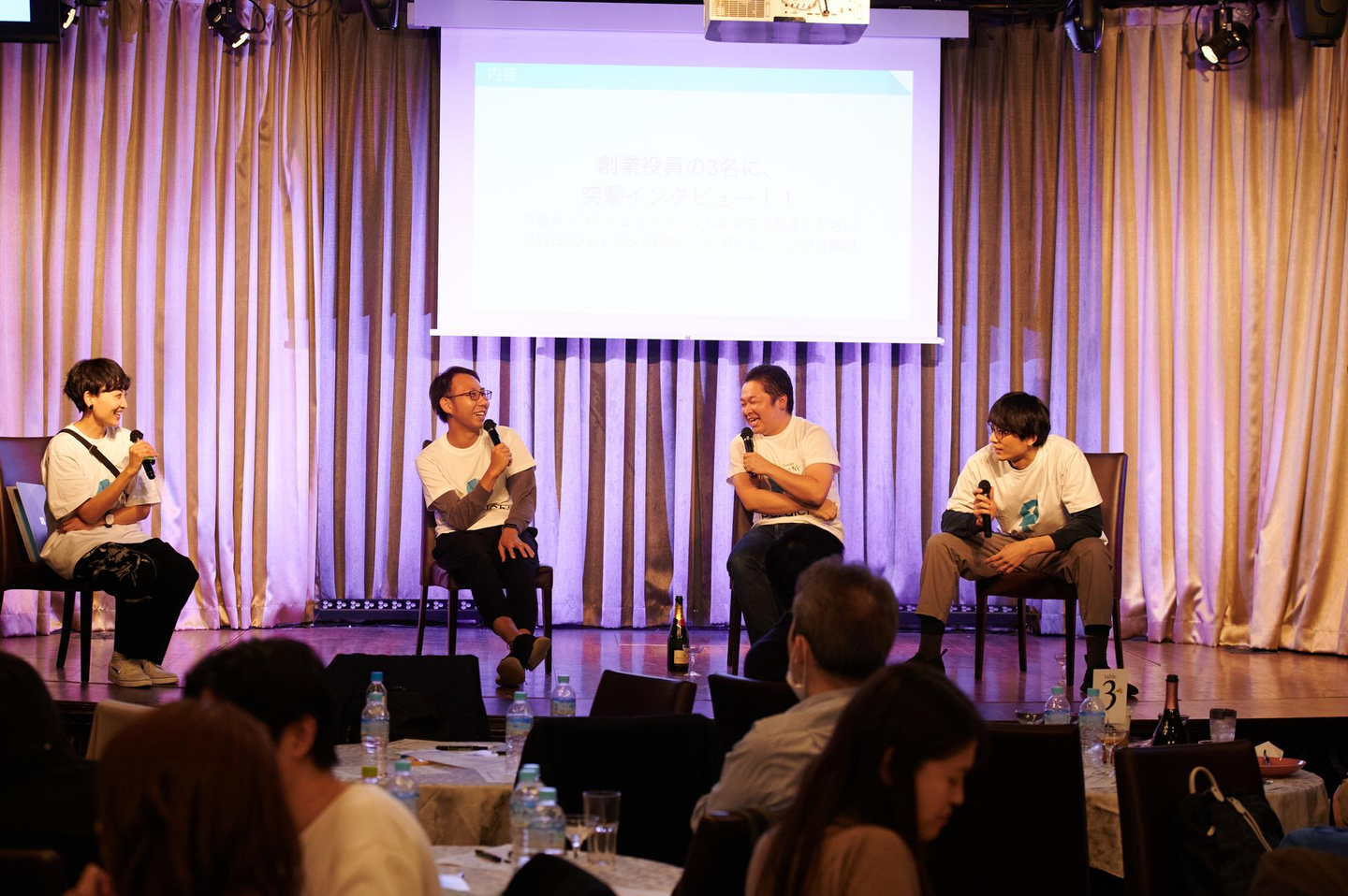 一方この頃会場では、ビュッフェ形式の食事やドリンクのサーブがスタート。参加者同士で交流するシーンや、一息つきながら座ってパネルトークを聞いているシーンも。交流するもよし、ステージトークを聞くもよし。自由に過ごせるような時間にしました。