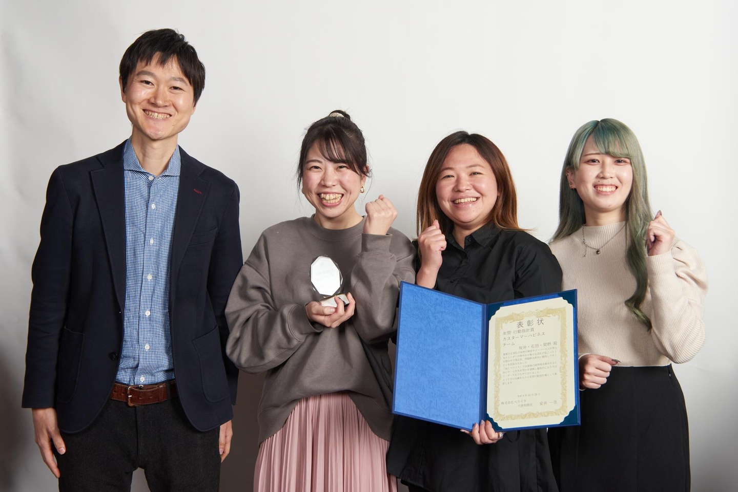 行動指針賞は個人表彰なのですが、今年は特例!なんと「カスタマーハピネス(=CS)チーム」がチーム単位での受賞となりました。メンバーの入れ替え、リーダーの育休などチームとして様々な混乱が起こった1年間の中で、顧客満足度を維持し続けクオリティを担保したこと、そしてチーム内外を問わず連携し「ALLペライチ」のチームワークでやり切りったことを評価されての受賞となりました。