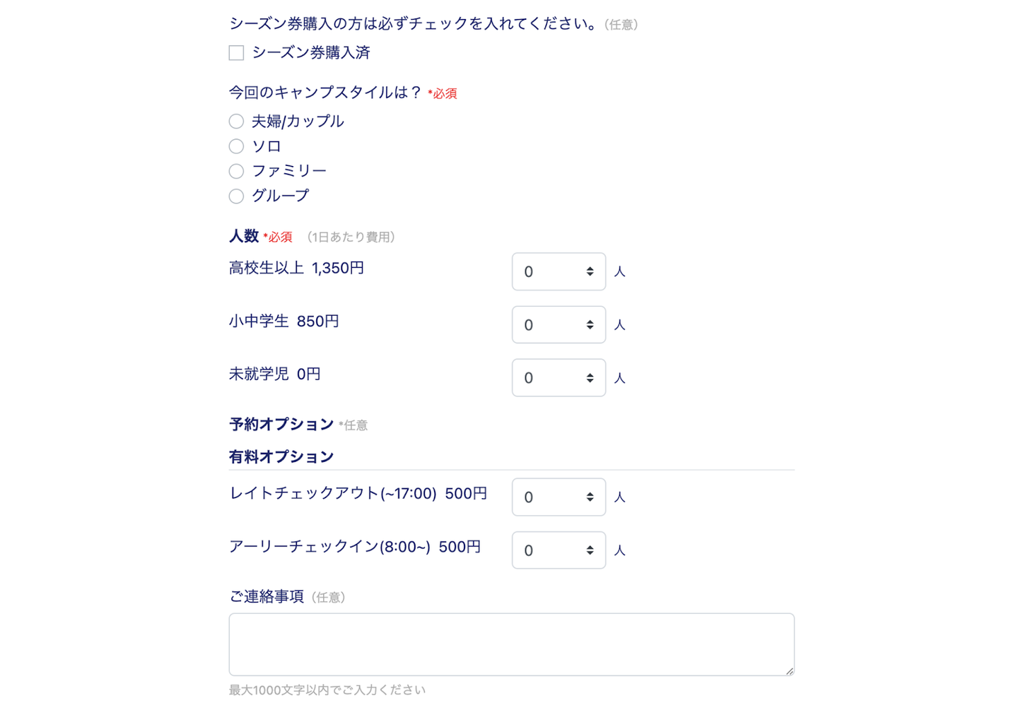 やりたいこととしては、予約時にサイト料金・人数に応じた料金設定を自動で算出し、事前決済もしくは現地で支払いを選択できるようにすることです。