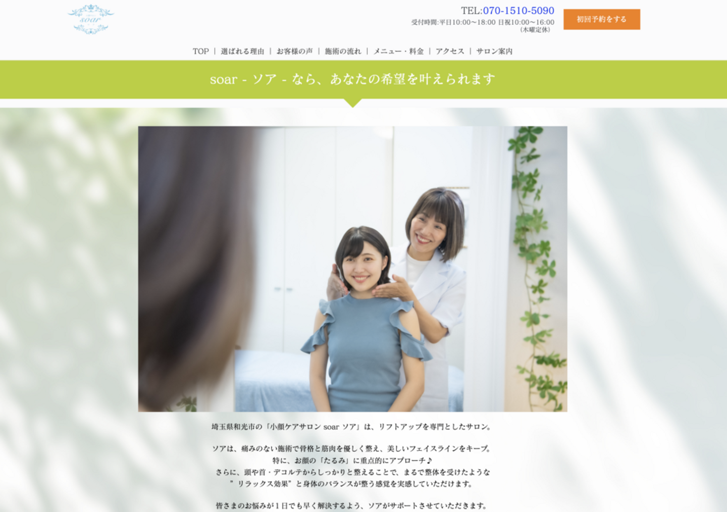 ▲小顔ケアサロンSoarのホームページ。サービスの特徴やこだわりを自由に表現している。