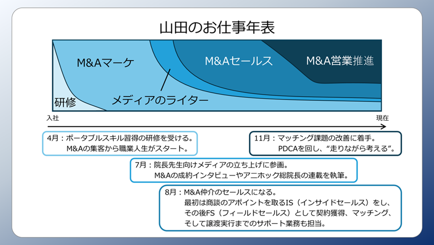 24新卒山田が1年目に担当した仕事。基本的にM&A仲介の領域で、