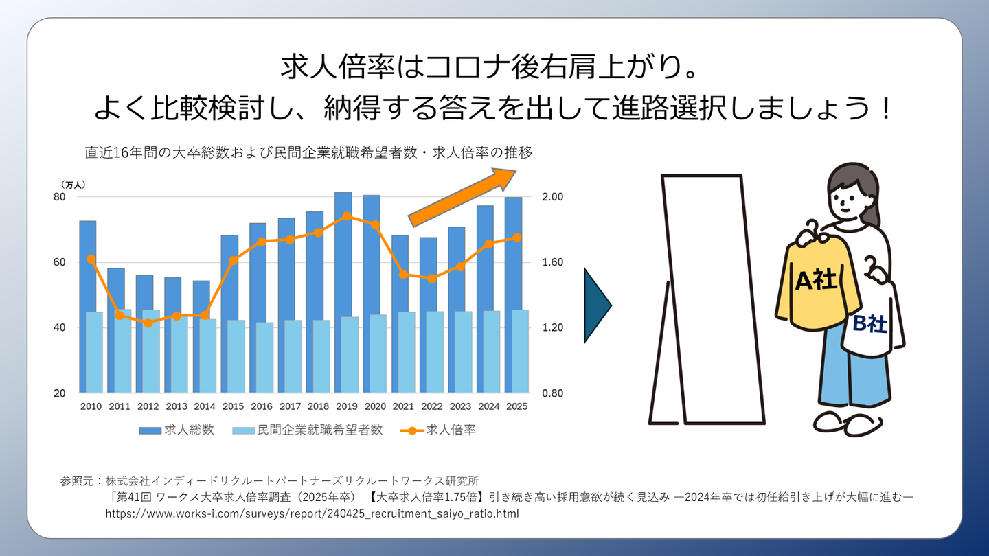 (参考:株式会社インディードリクルートパートナーズリクルートワークス研究所「第41回 ワークス大卒求人倍率調査(2025年卒)【大卒求人倍率1.75倍】引き続き高い採用意欲が続く見込み―2024年卒では初任給引き上げが大幅に進む―」