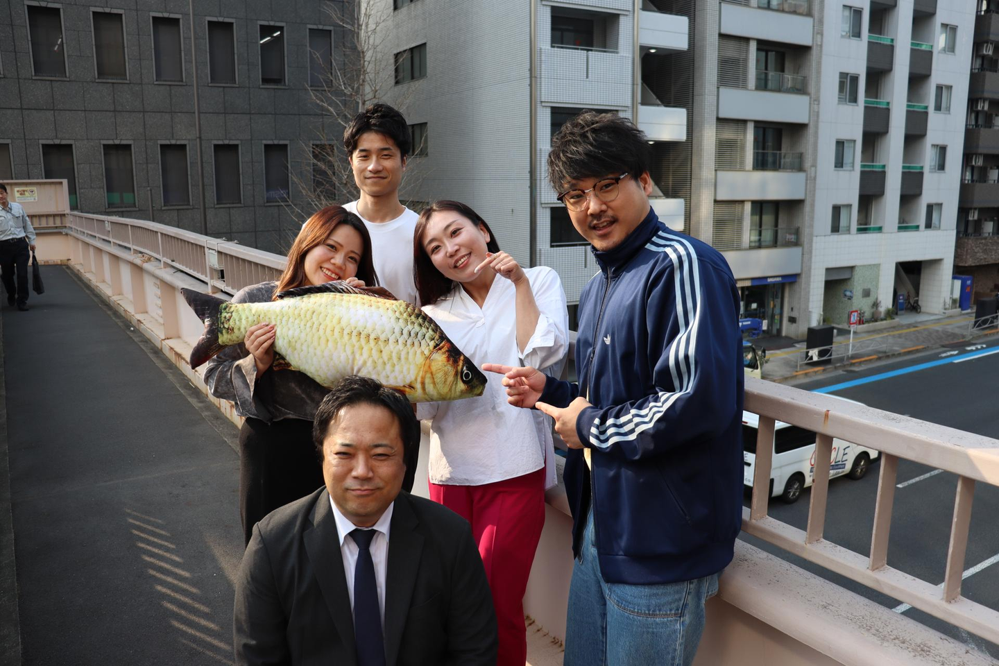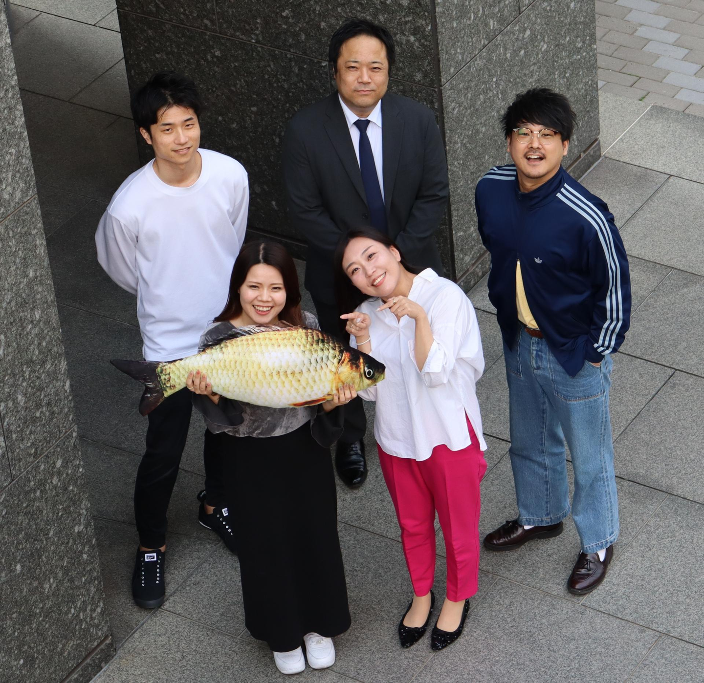 三浦さん愛用の魚のクッションと一緒に集合写真。最後まで「楽しく仕事をする!」が伝わるようなインタビューでした