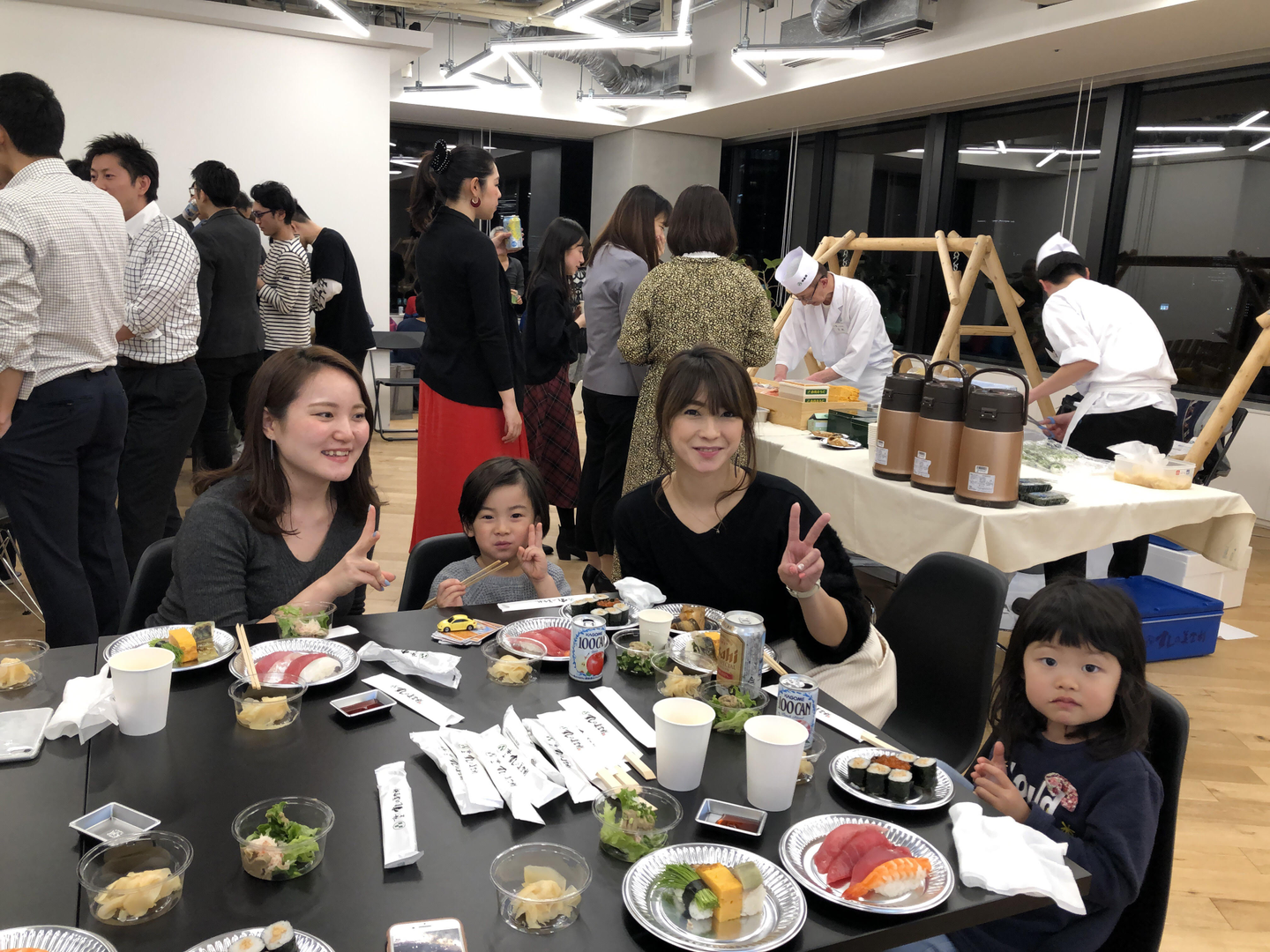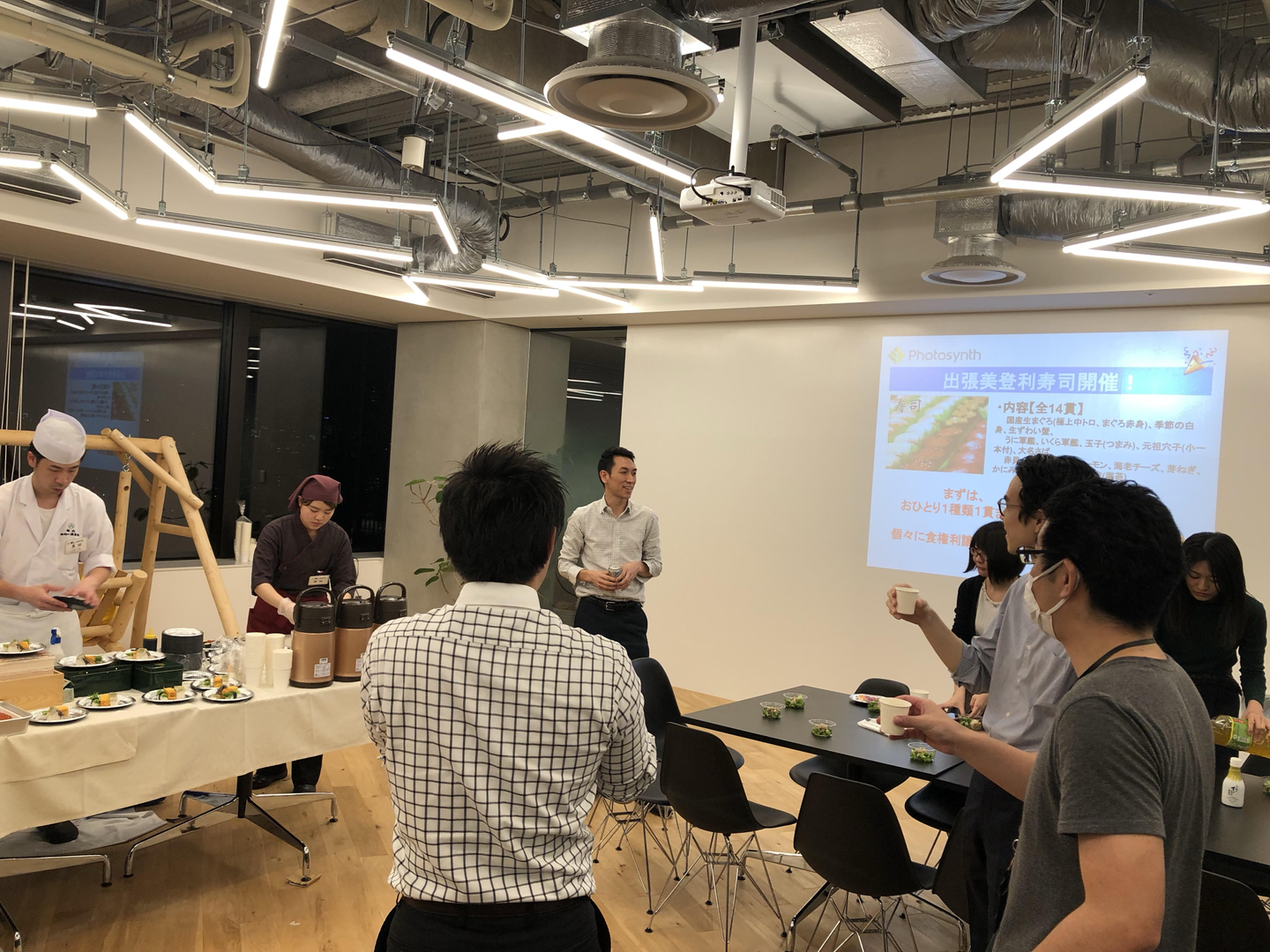 毎回社員に好評のフォトシンスご飯会を、カフェスペースにて開催しました。 今回は、なんと美登利寿司さんの出張握りです!