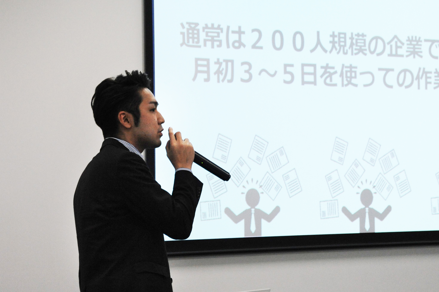 11月9日(木)にヒューマンテクノロジーズさま、マネーフォワードさまと共催でセミナーを実施し、営業部長の土田さんがプロダクトの説明と「KING OF TIME」「MFクラウド給与」「Akerun Pro」を連携することで便利になることをプレゼンしました。