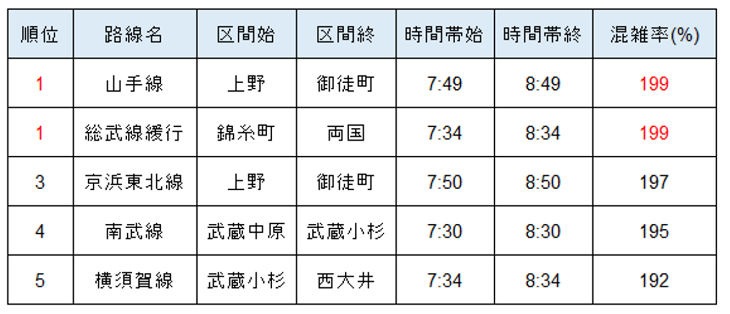 こちらは国土交通省の調べによる、混雑率が高い路線と時間帯ベスト5です!