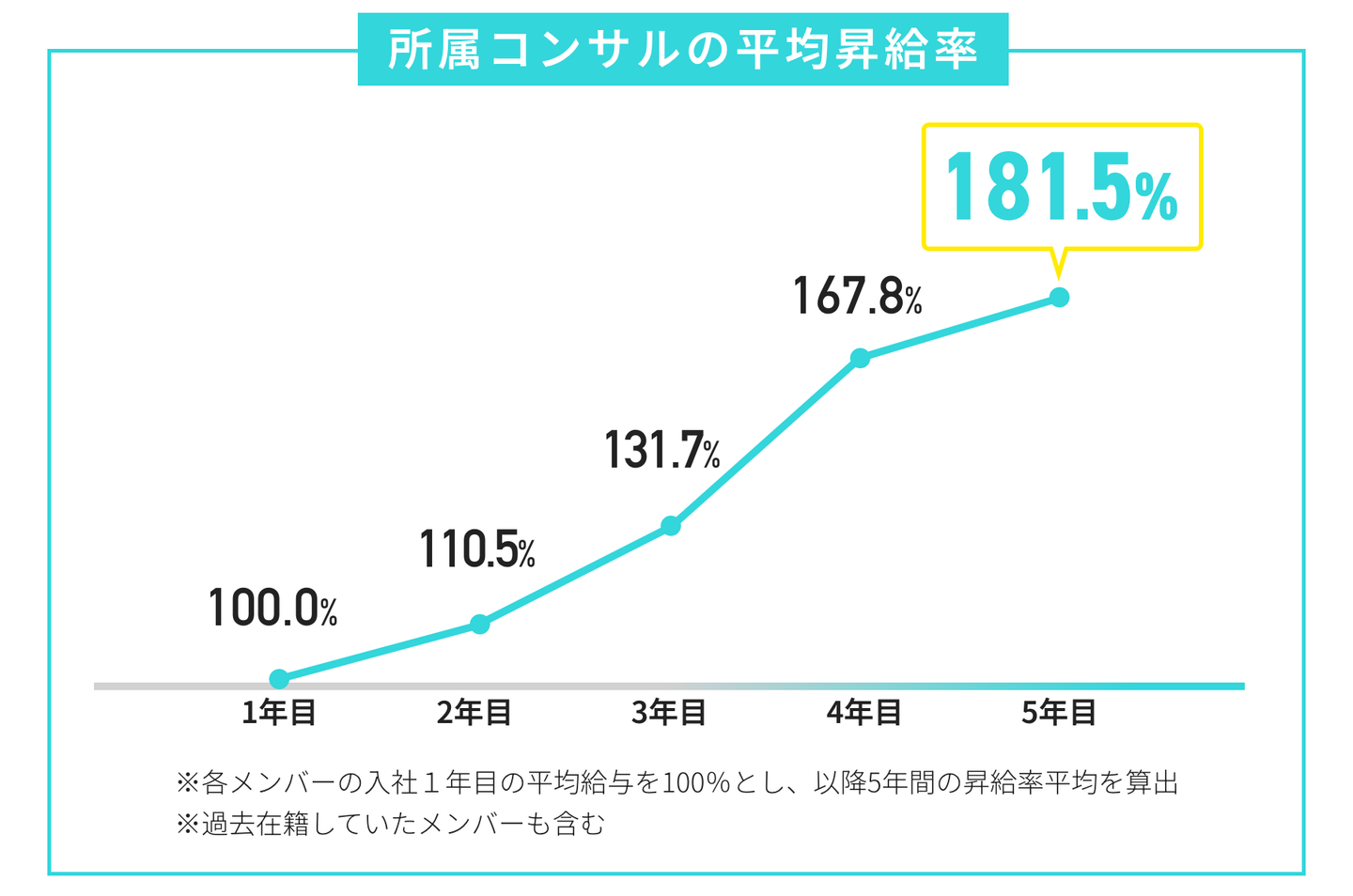 PIGNUSのコンサルタントは、入社1年目を100%としたとき、5年目には平均181.5%の昇給率となっています。この数字は「年功序列で自動的に上がる」というものではなく、価値提供の質に応じて評価される仕組みがあるからこそ実現しているものです。