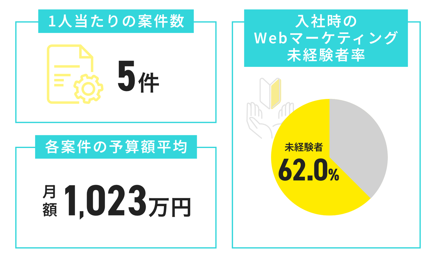 アドコンでは、1案件あたり月1,023万円の平均予算と、事業インパクトの大きい領域を扱っています。そして、この環境で活躍しているメンバーの62%が、Webマーケティング未経験で入社しています。