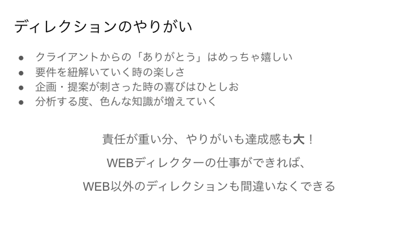 全社ミーティングでは、その後に開発系のWEBディレクターの話も担当者が発表し、WEBディレクターへの理解が深まったところで「やりがい」についても発表いただきました。