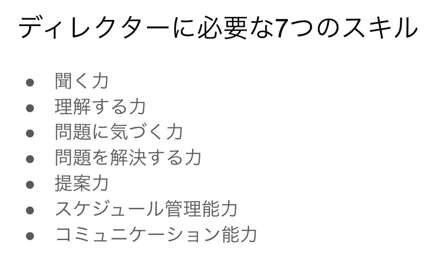 Y:ディレクターになるための必要スキルは、ディレクターに必要な7つのスキルのうち正直どれが欠けても少し厳しいかなとは思います。