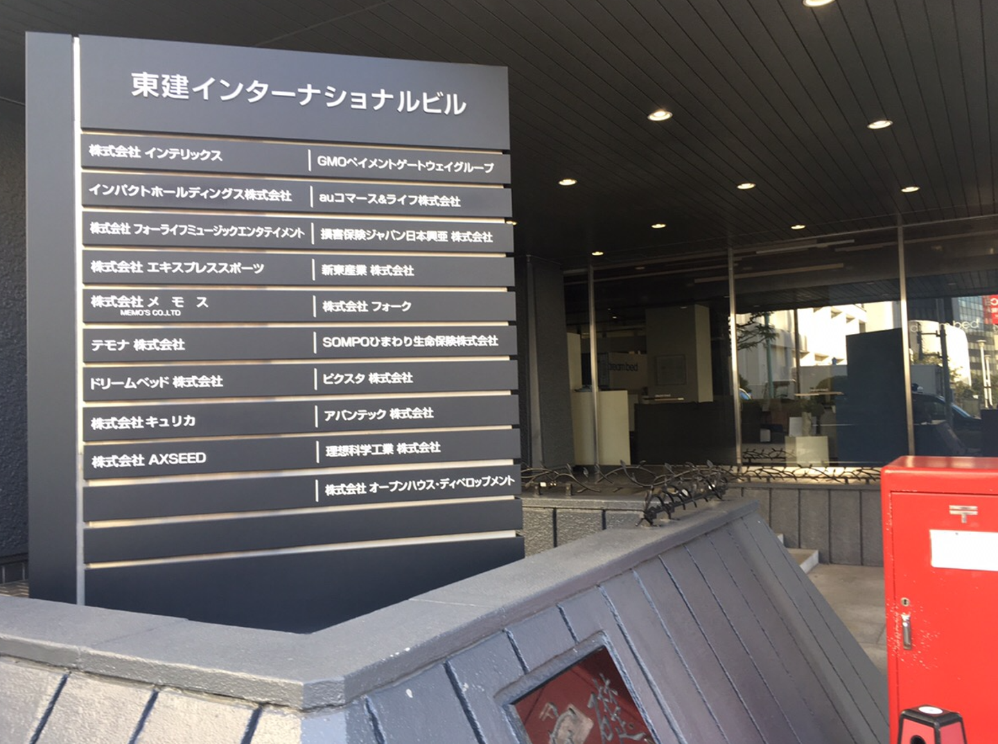 東京建物と書いたビルの入り口には入居している会社の名前がずらり。ピクスタもちゃんと載っていますね。