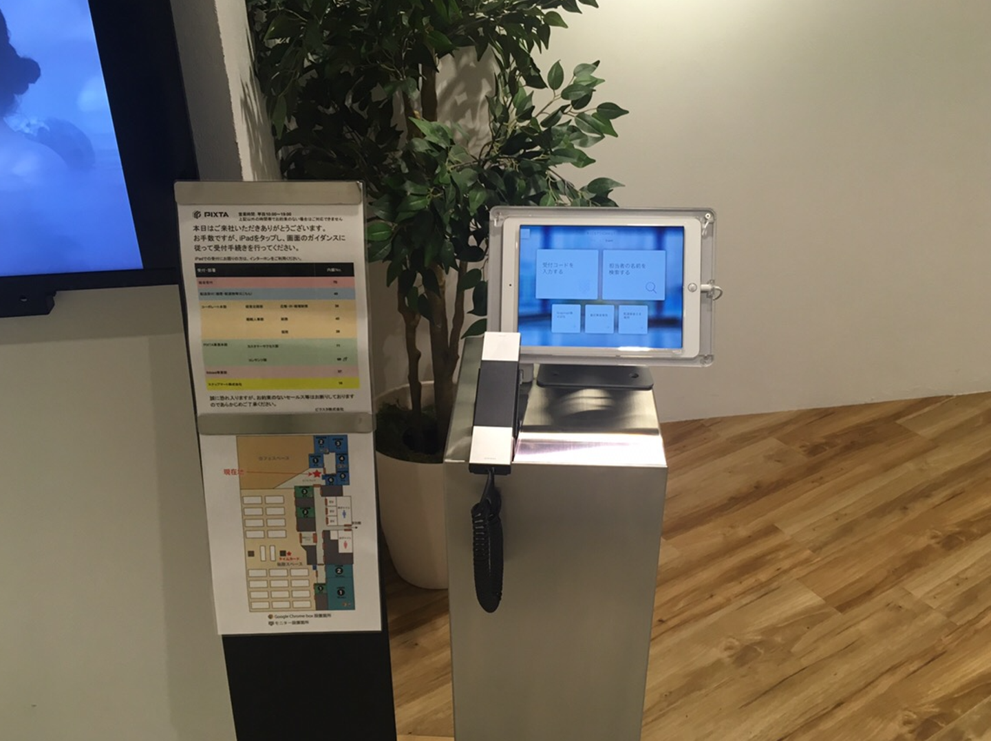受付のiPadで担当者を呼び出したら、お迎えに行くまで左手のソファでお待ちください!