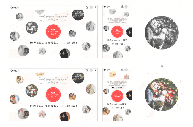 そんな中、サービス提供開始当初からプラコレのサービスカラーであるモノトーンのトンマナは使用は継続。"価値観が多様化する時代に、"それぞれカップルの色に染まりたい"という理由で、色を使わない白と黒を基調にしたサービスカラーを精選しております。
