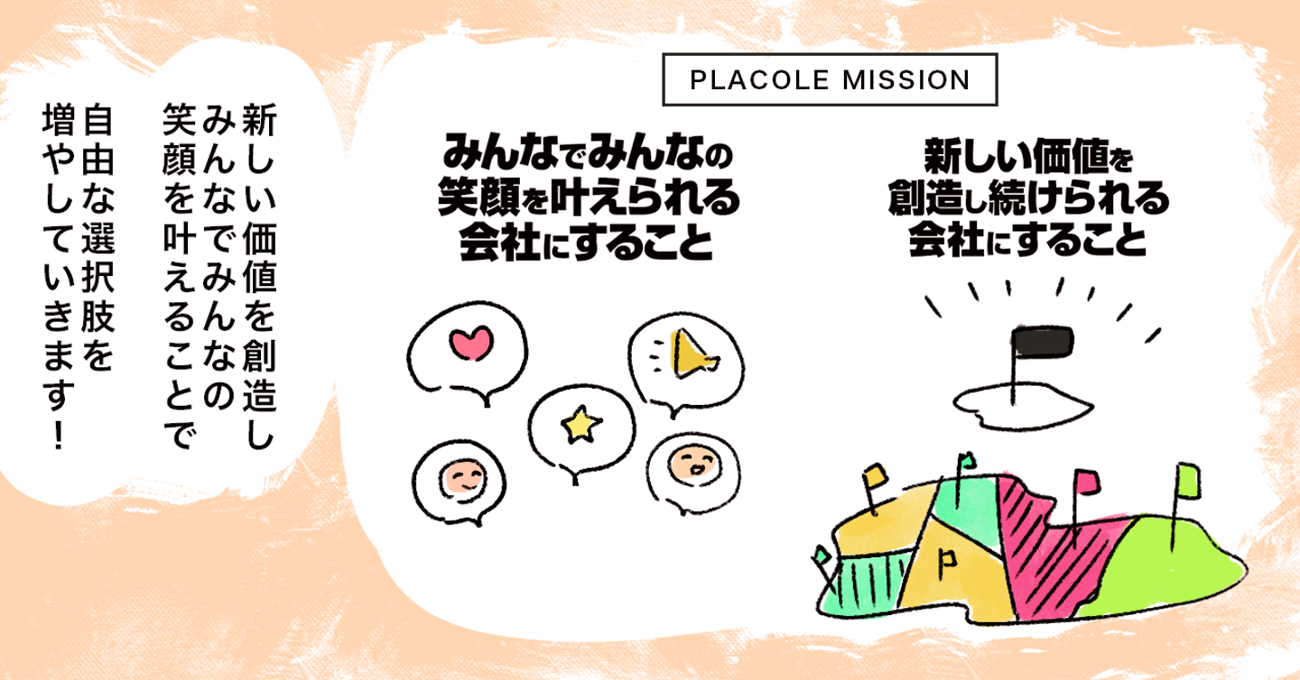 本日はプラコレが創業期から掲げる経営理念についてお話します。私達には2つの経営理念があり、『新しい価値を創造し続けられる会社にすること』『みんなでみんなの笑顔を叶えられる会社にすること』の2点を掲げています。本日は後者の『みんなでみんなの笑顔を叶えられる会社にすること』についてご紹介します。