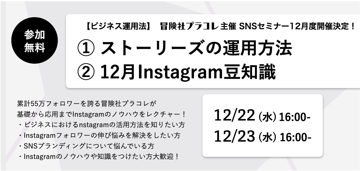 【ビジネス運用はストーリーズが鍵!】企業のためのInstagramノウハウ徹底解説!冒険社プラコレのSNS無料セミナー <12月開催> が決定!