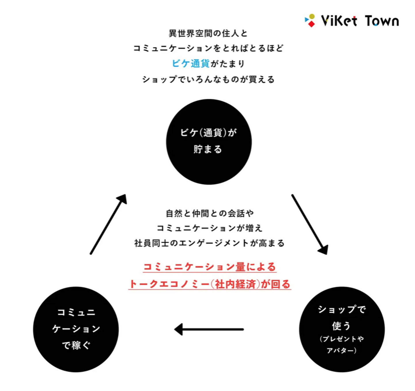 ViKet Townには、異世界空間でつかえる通貨(ビケ)が存在。 その通貨の獲得方法は、アバター同士のコミュニケーション量によりマイニングされるので、積極的なコミュニケーションが行われます。その通貨の使い道は、自分のアバターの服を買ったり、仲間へのプレゼントを買ったりできます。コミュニケーションで稼ぎ、コミュニケーションのために使う、以下の図のような社内経済が活性化することが期待できます。