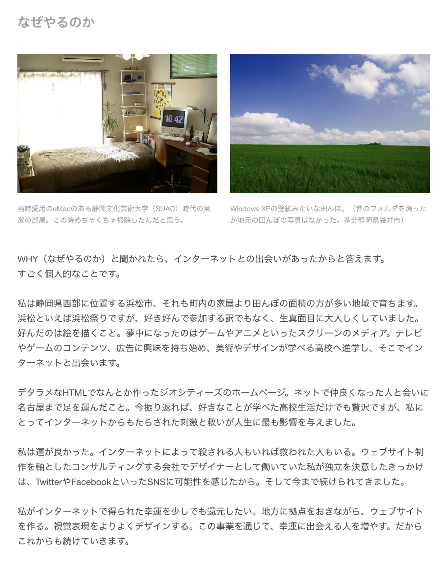 このWHY(なぜやるのか)のテキストは企業ページの「私たちについて」で見ることができる。